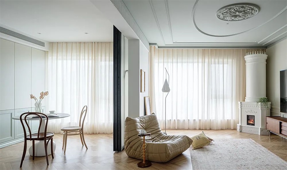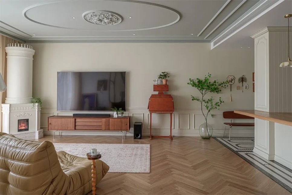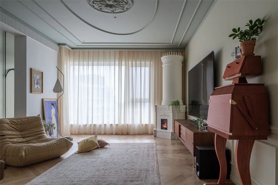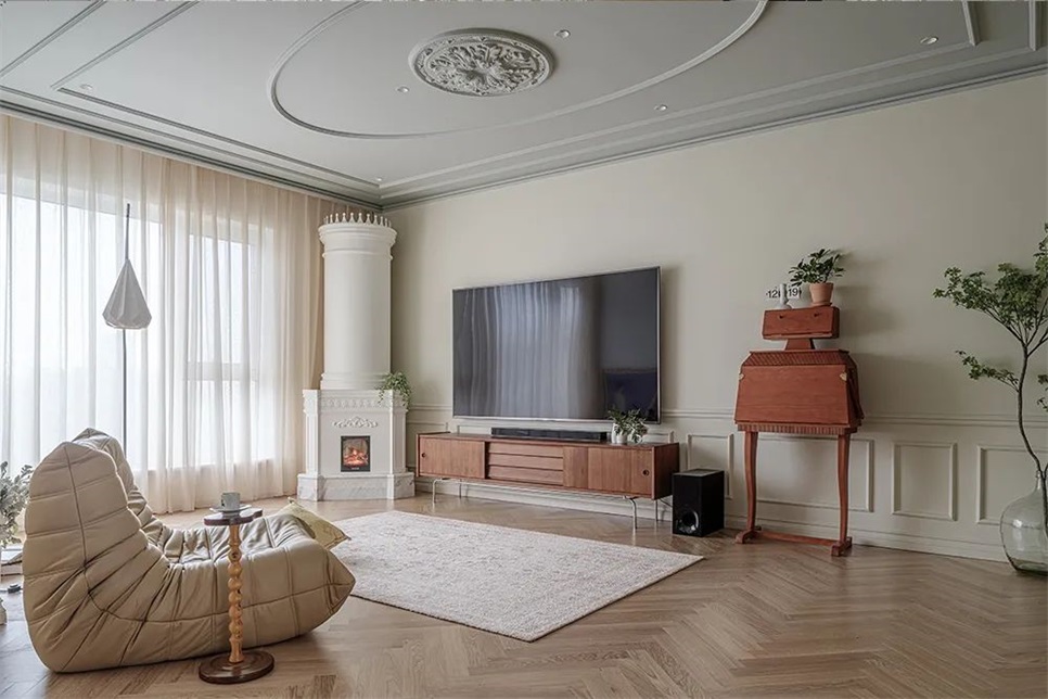 The living room is deliberately designed without a main light, freeing up the height as much as possible. Under the decorative lamp plate, there is no bloated multi-seat sofa, and only a carpet is laid. On the one hand, there is enough space for hairy children to run freely, and on the other hand, it is easy to clean and manage.