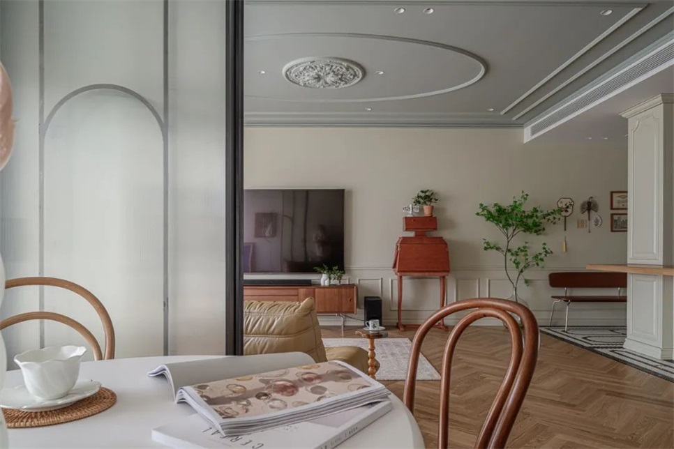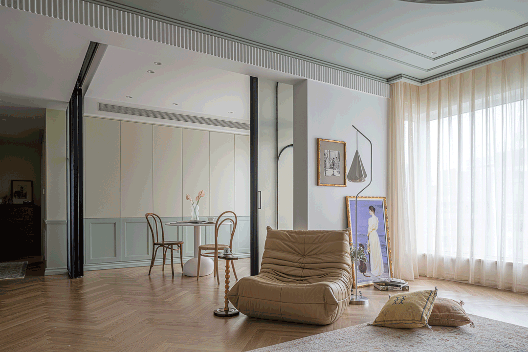 再进入客厅,我们拆除了原先次卧和客厅的半堵隔墙,用三联动移门作为隔断,这样日常打开,餐厅(多功能)与客厅形成了一个通透感十足的大开间!