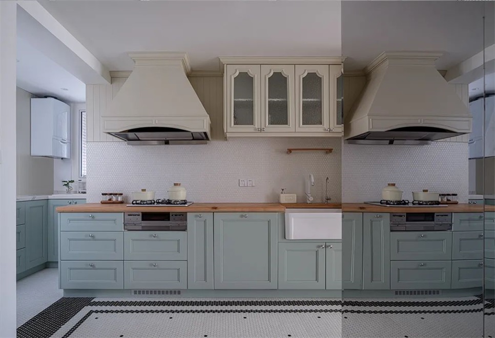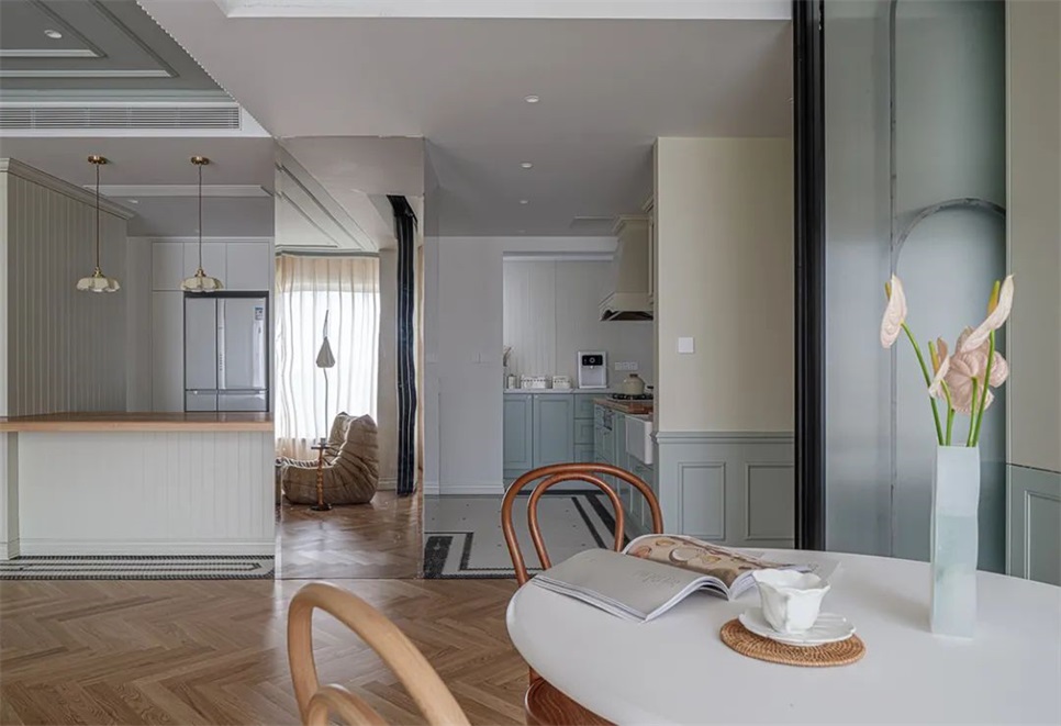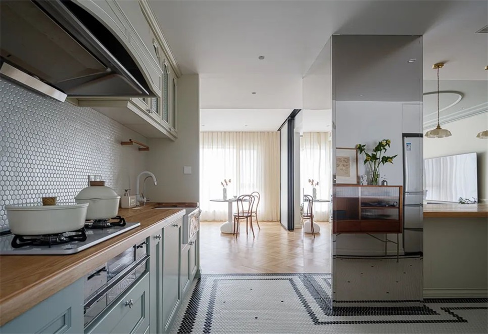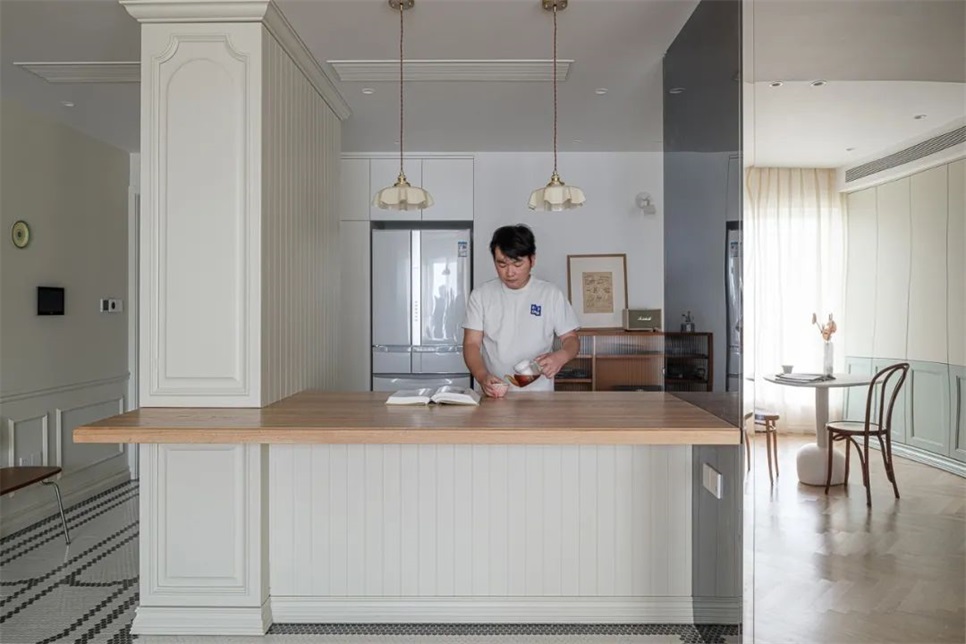 The original partition walls on both sides of the kitchen were removed, and the kitchen had two entrances leading to the living room and the porch. Thus, the open kitchen formed a migration line. In addition to the north-south connection with the restaurant (function room), the ventilation performance is greatly improved, but also allows multiple functional areas to be integrated, and the space is more interactive.
