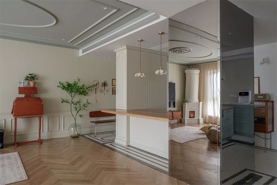 增设了玄关立柜,归家更衣换鞋收纳便捷外, 高柜与衔接的吧台也形成了隐私保护屏障;