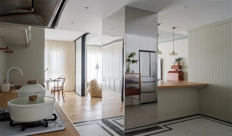The transformation episode, after the removal of the non-load-bearing wall, left a very strong bearing column, very eyesore, so we use stainless steel mirror to make a four-sided mirror, so that the column stealth. The beginning of the hostess is still very worried not necessarily harmonious, the result: overjoyed! Satisfaction beyond expectation!