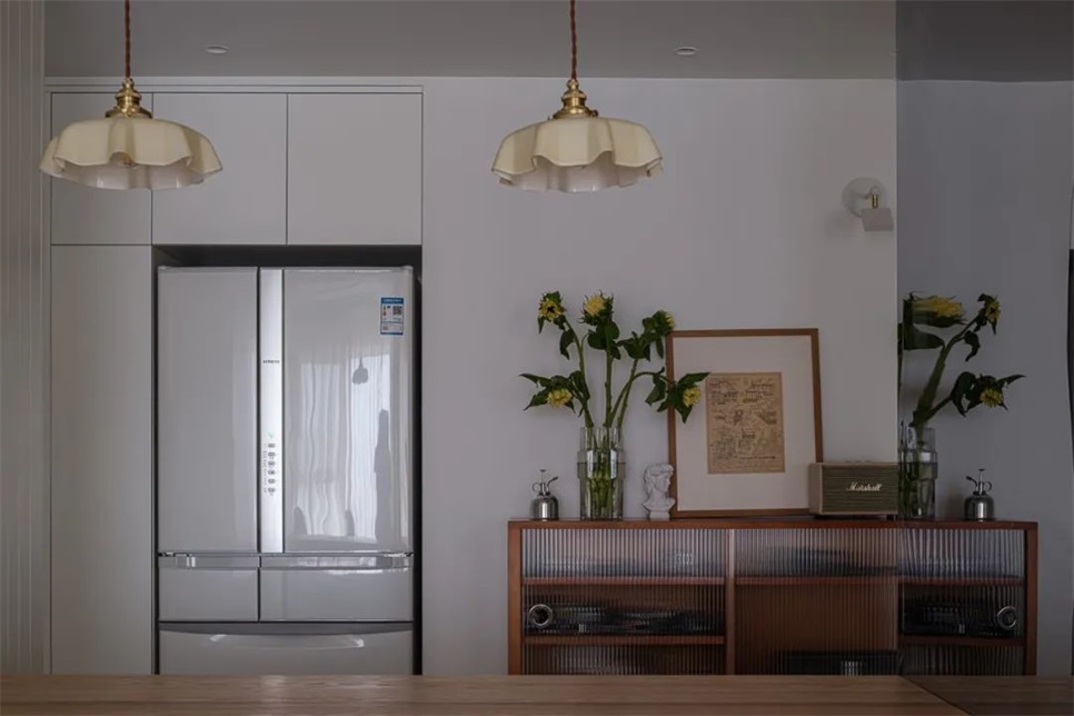 In the original functional balcony on the north side, the partition doors and Windows were removed to accommodate the whole space into the kitchen, which on the one hand supplemented the storage of the kitchen and on the other hand broadened the space vision.