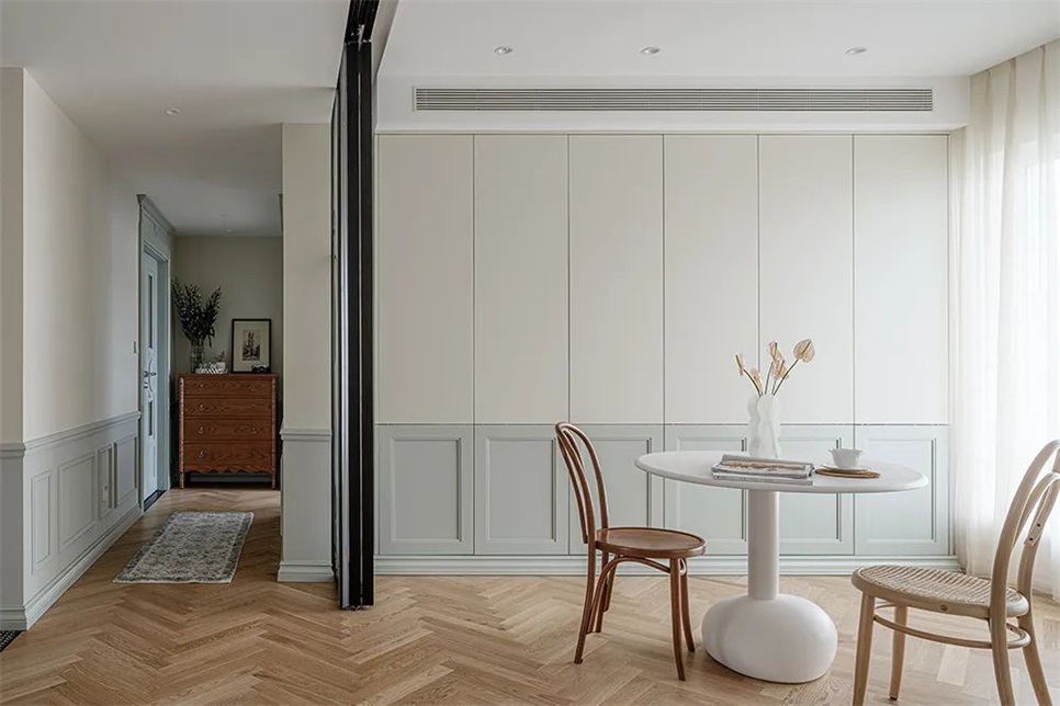 In order to make the space more concise, we plan a wall cabinet in the dining room (function room), which becomes the storage center of the living space. The bookcase, sundries cabinet and housekeeping cabinet are all located here, and the storage capacity is very sufficient.