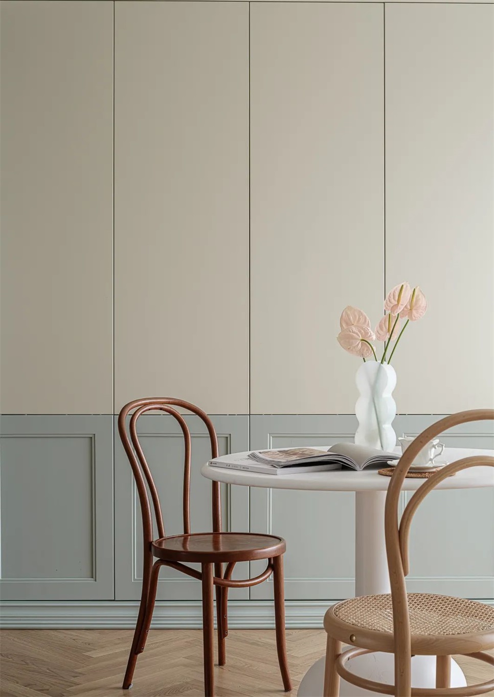 值得一提的是软配单品,简练克制,但小有来头:白桌来自西班牙品牌Sancal,餐椅则是简洁利落代表的GTV。