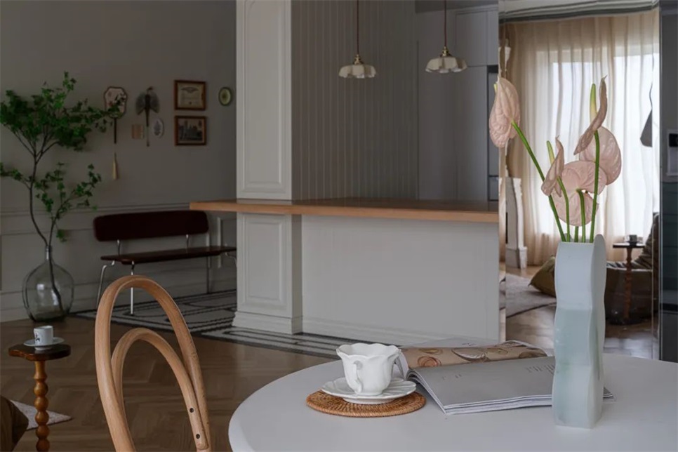 玄关柜衔接了岛台,先生经常在此调制不同口味的饮品,一个敢做一个敢试,也就产生了生活的各种小惊喜。