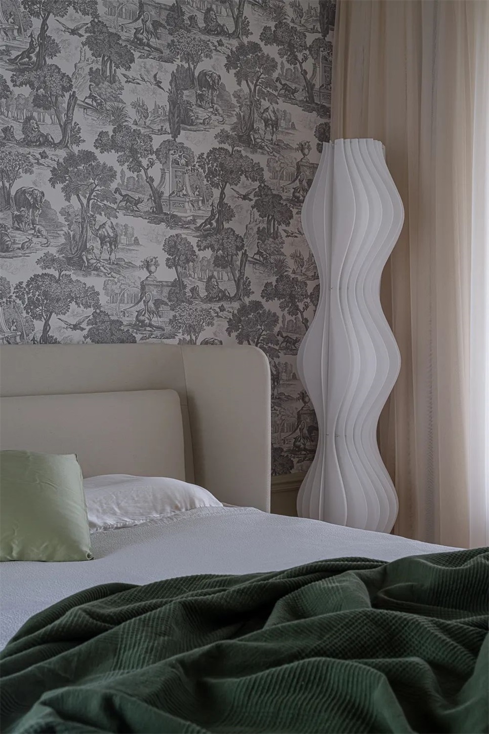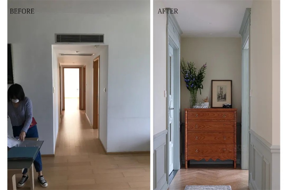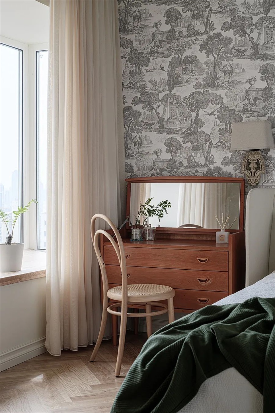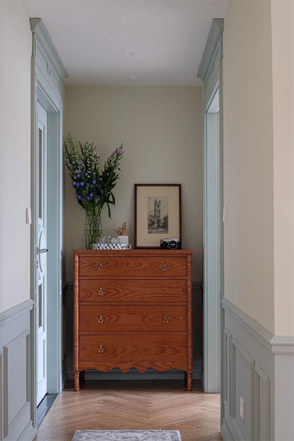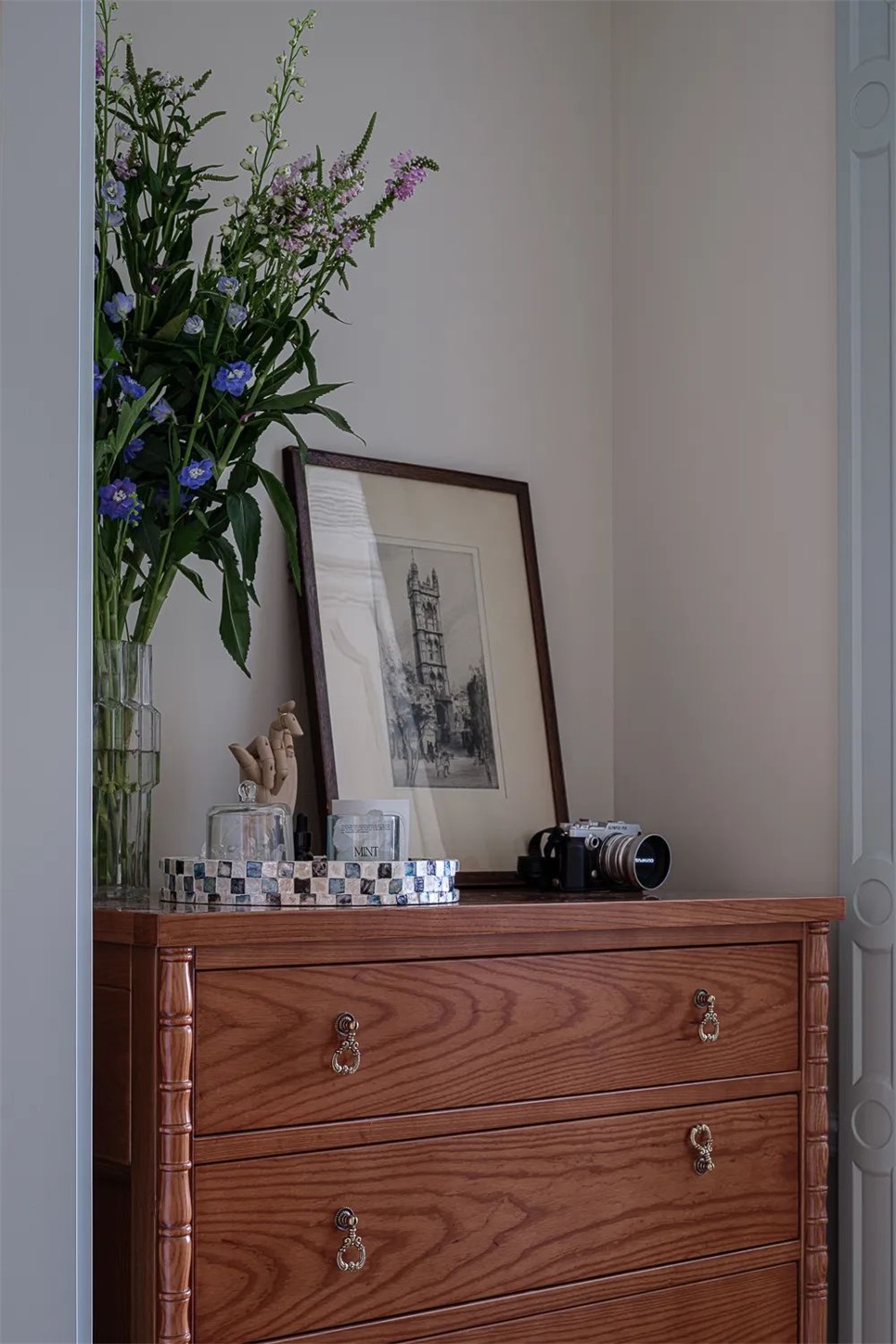 从卫生间出来,正对面就是卧室了,门口的复古斗柜,选择了宽度正合适的一款。斗柜背后是原户型主卧门洞,填补后也有了走廊视觉尽头的优雅。这个部分也是我们留的一个小心机,目前夫妇俩5年内没有生育计划,保不准再远的未来有变化,目前仅夫妇两居住,将两卧室二合一,形成了超开阔了大卧室。(轻体墙易拆除,未来有变,也轻松拆改变更。)