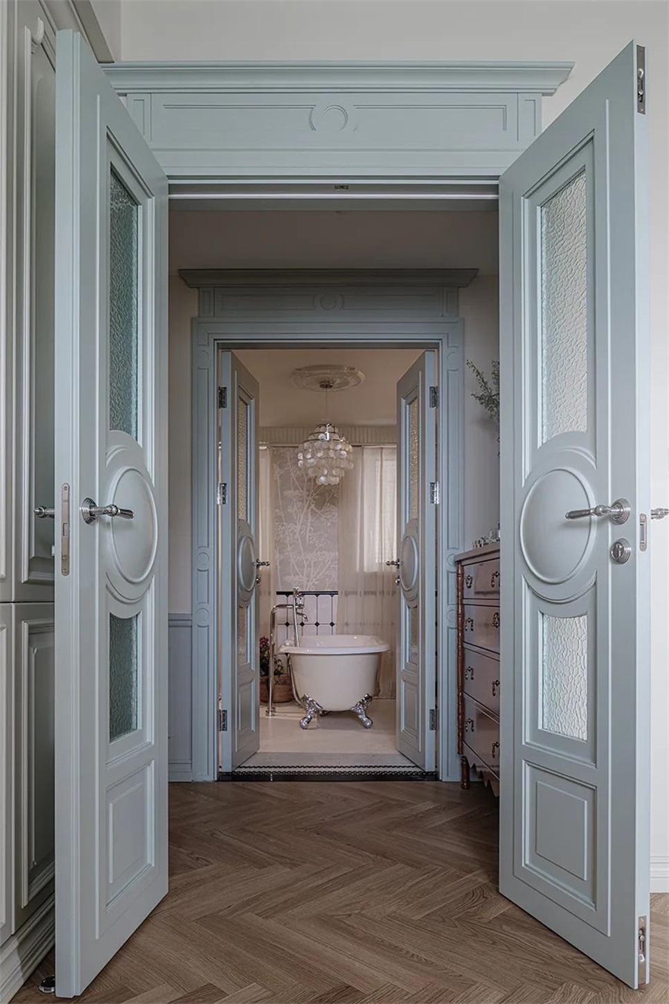 From the bathroom, opposite is the bedroom, the retro bucket cabinet at the door, choose a width is appropriate. Behind the bucket cabinet is the door of the master bedroom of the original house, which also has the elegance of the visual end of the corridor after filling. This part is also a careful machine that we leave. At present, the couple has no birth plan in 5 years, and no further changes are allowed in the future. At present, only the couple lives together, and the two bedrooms are two in one, forming a super open bedroom. (Light body wall is easy to dismantle, future changes, also easy to dismantle change more.)
