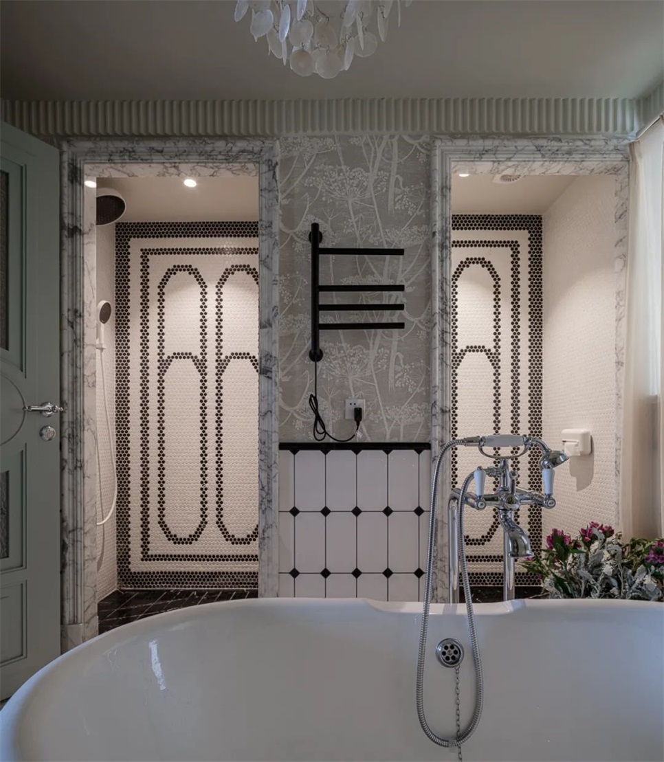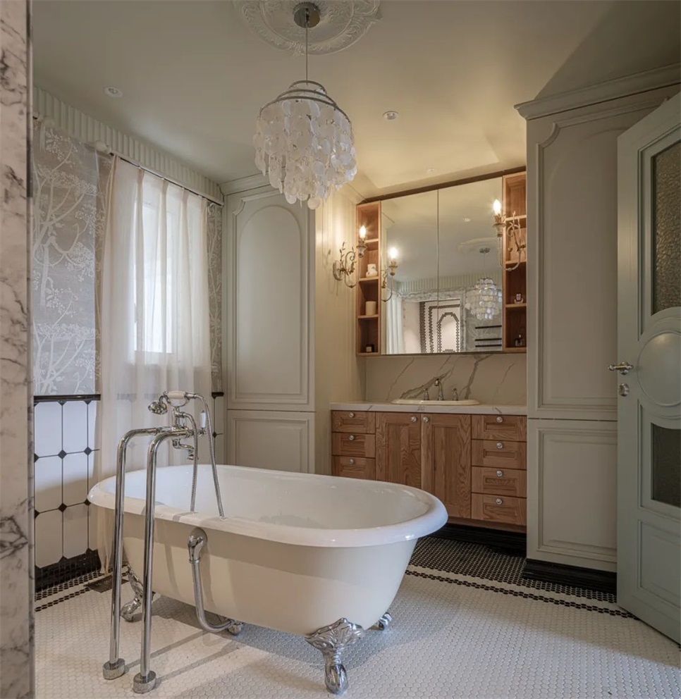 As a "bathtub" just needs a large household, after removing the partition wall of the two small toilets of the original house, the "new" bathroom space is upgraded to 11m square meters. The bathtub is arranged in the center line of the original two narrow Windows, which makes the sense of ritual enough at the same time, there are plenty of aisle space around.