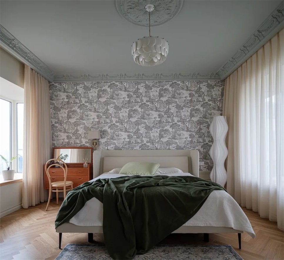 With bay Windows on both sides, the lighting and ventilation on the top floor are unbeatable. In addition to the oversized width of the two-in-one bedroom, the depth of the original building itself is also very excellent. Even if the 1.8 large bed is comfortably placed on both sides of the dresser and floor lamp, there is still a transparent and sufficient space.