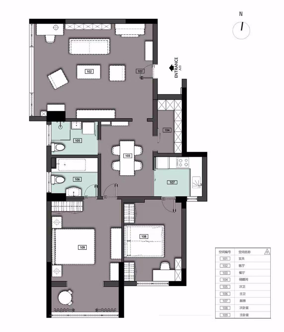入户处增设玄关收纳间,出入随行物品有去处,利用电视背景墙做隔断,增加私密性;