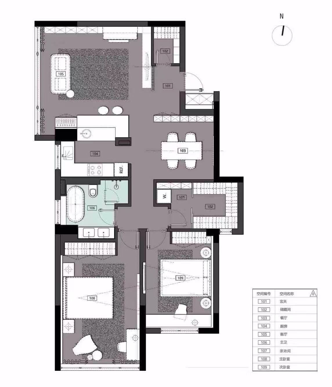 调整次卧动线,让原厨房向走道延展,增加储存空间,改变功能做为:衣帽间+洗衣房+家政间,家政工作更轻松;