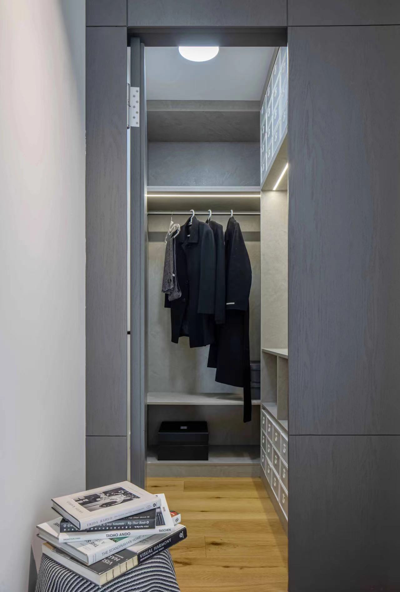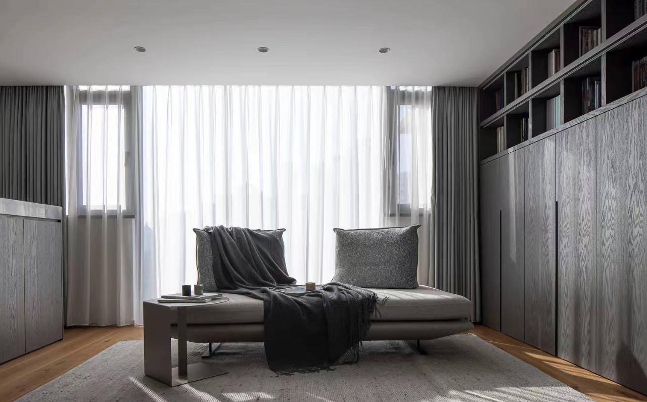 有别于往常承接较多北欧、MCM、法式等装饰性较浓的项目,这对业主夫妇来自朋友的推荐,重视空间收纳的同时,更偏好简练色彩,也因此我们完成了一个做减法而有别于其它项目的低彩度空间。