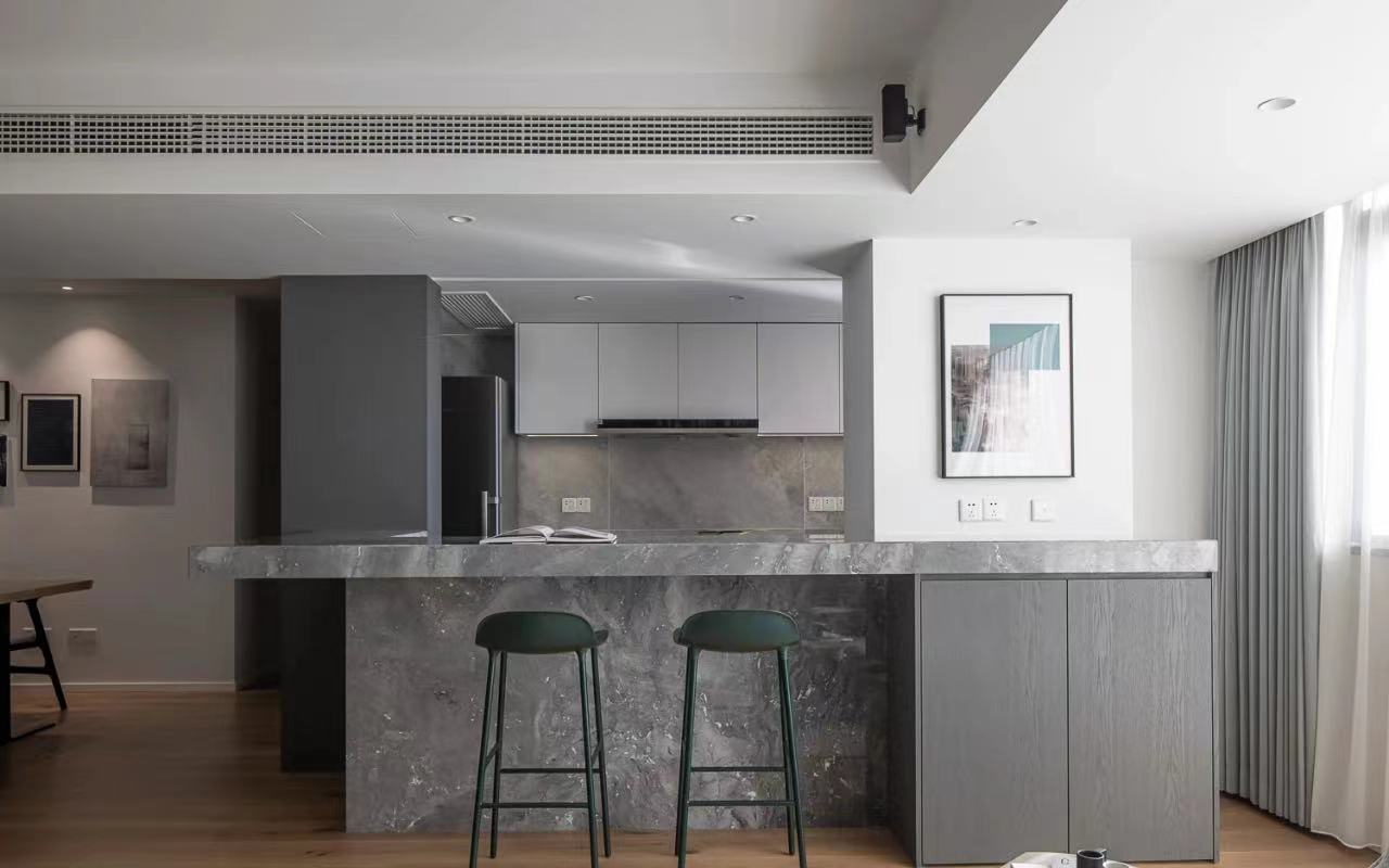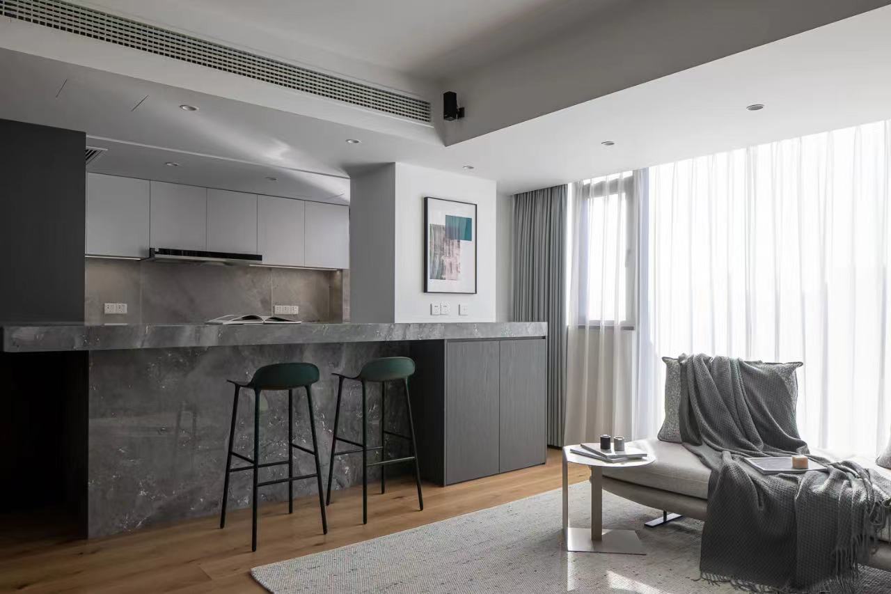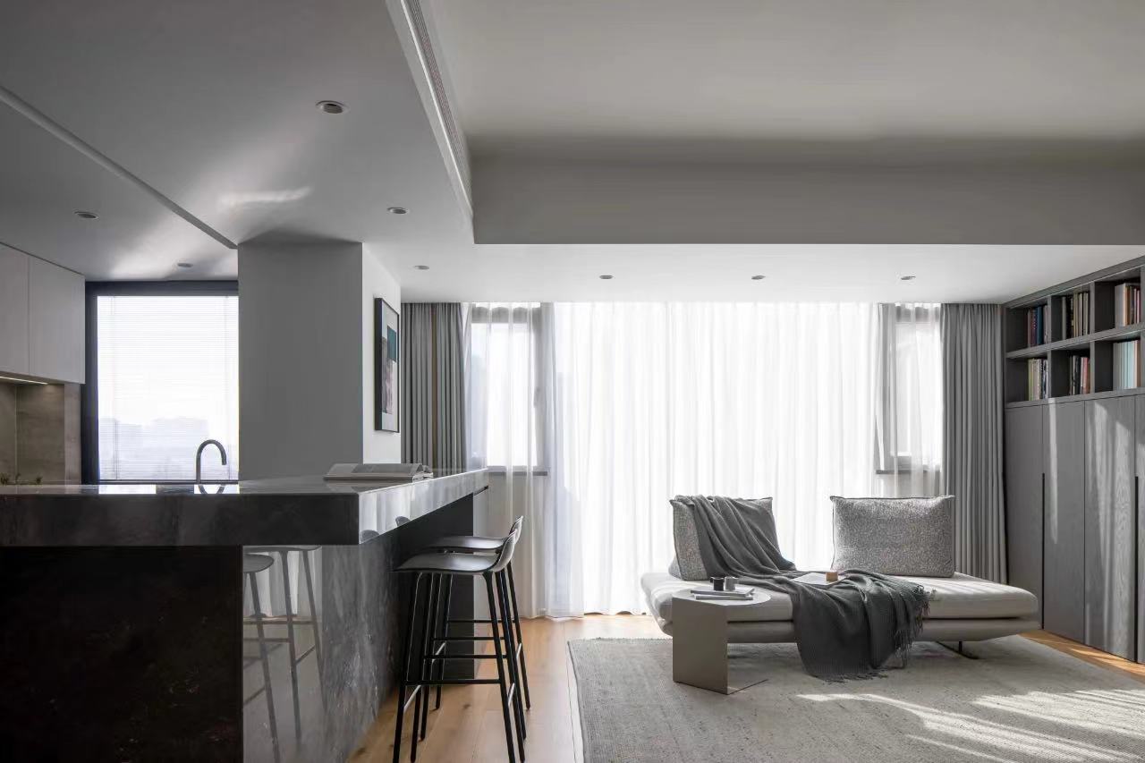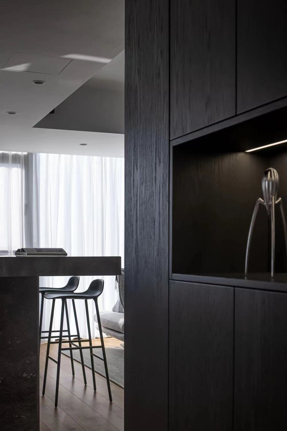 The dining room is no longer a closed space, natural light can be better penetrated, and the line of sight can interact with the family in the living room. Grooves are reserved above the bar for the electric lifting curtain, which acts as a barrier to oil smoke, and can form a closed space after closing.