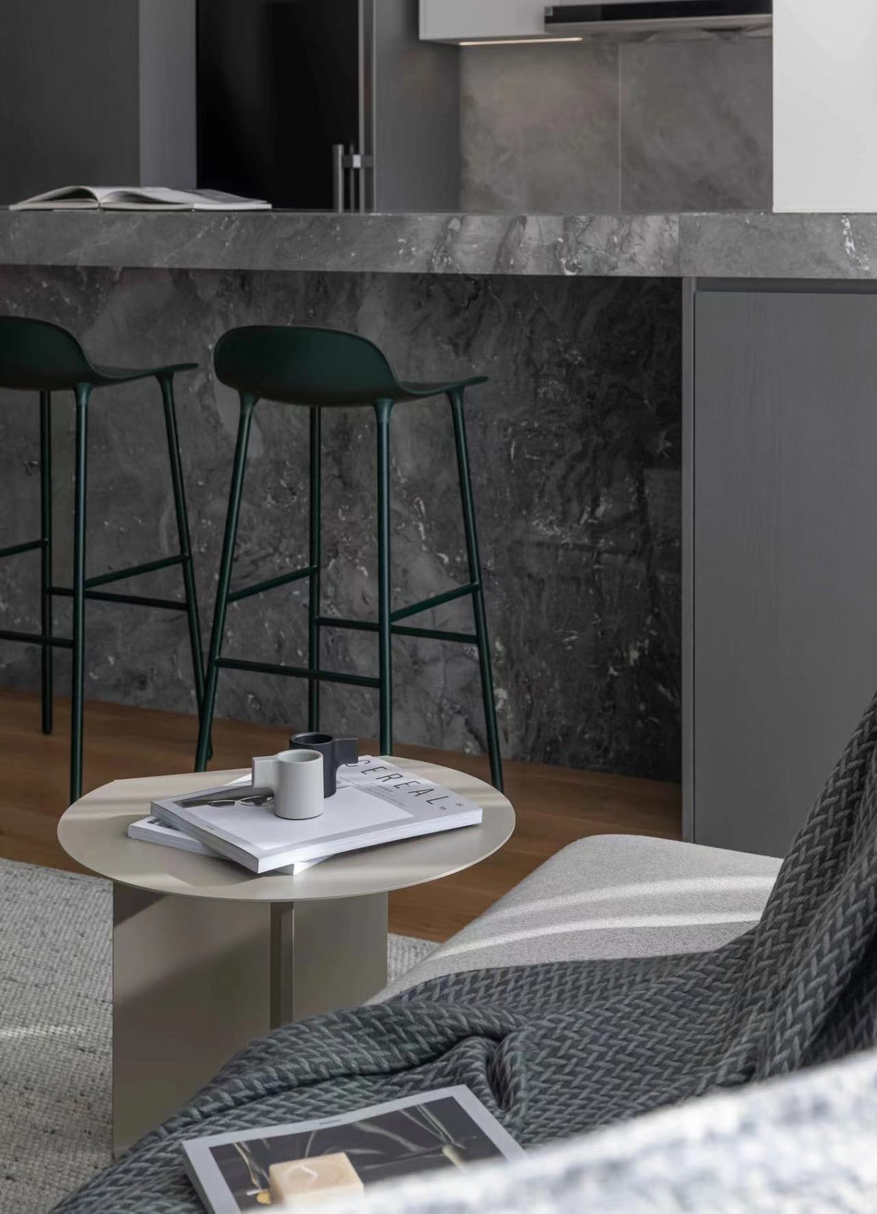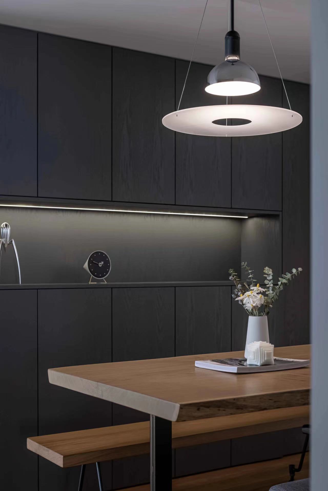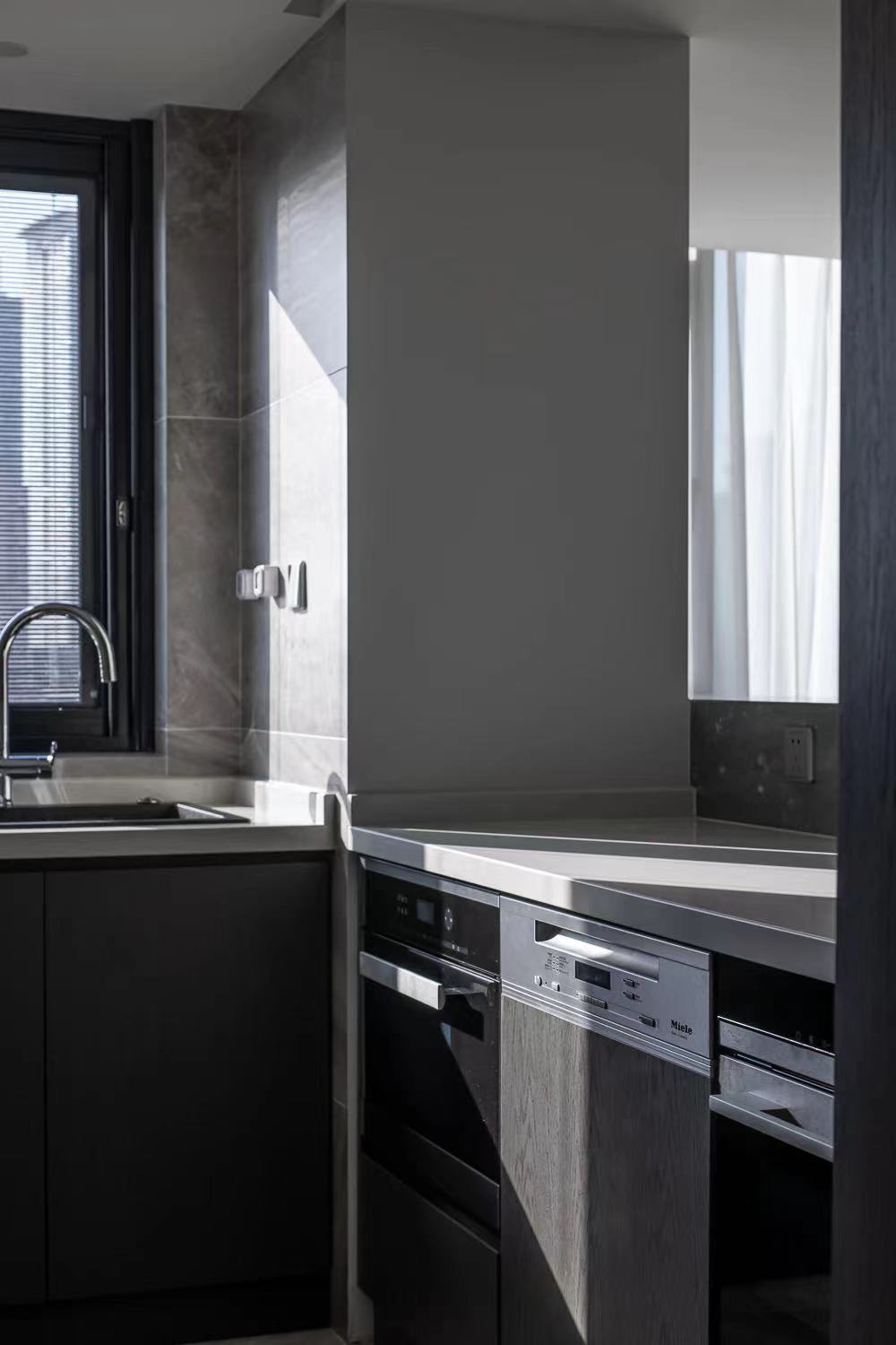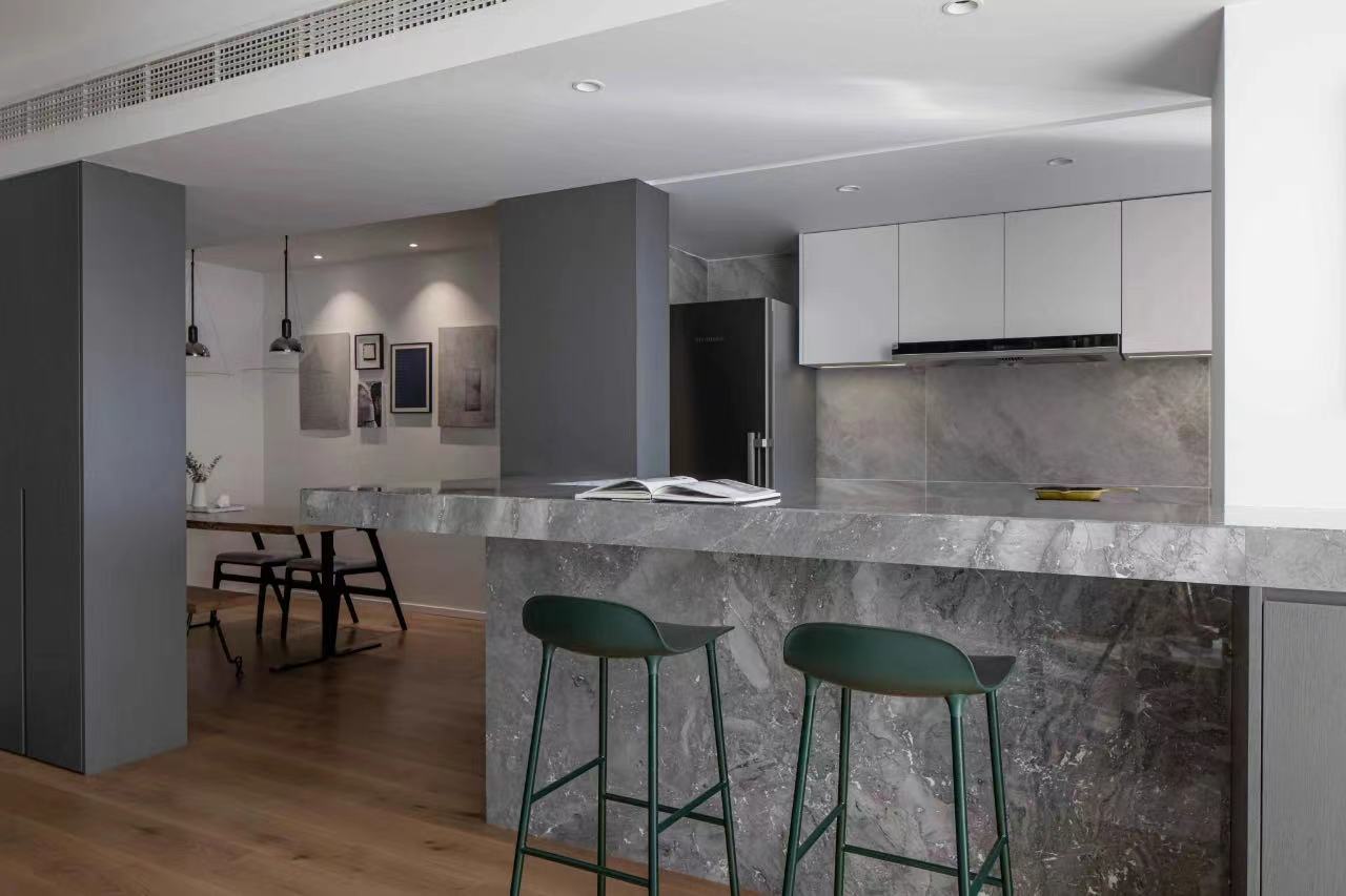 The dining room is no longer a closed space, natural light can be better penetrated, and the line of sight can interact with the family in the living room. Grooves are reserved above the bar for the electric lifting curtain, which acts as a barrier to oil smoke, and can form a closed space after closing.