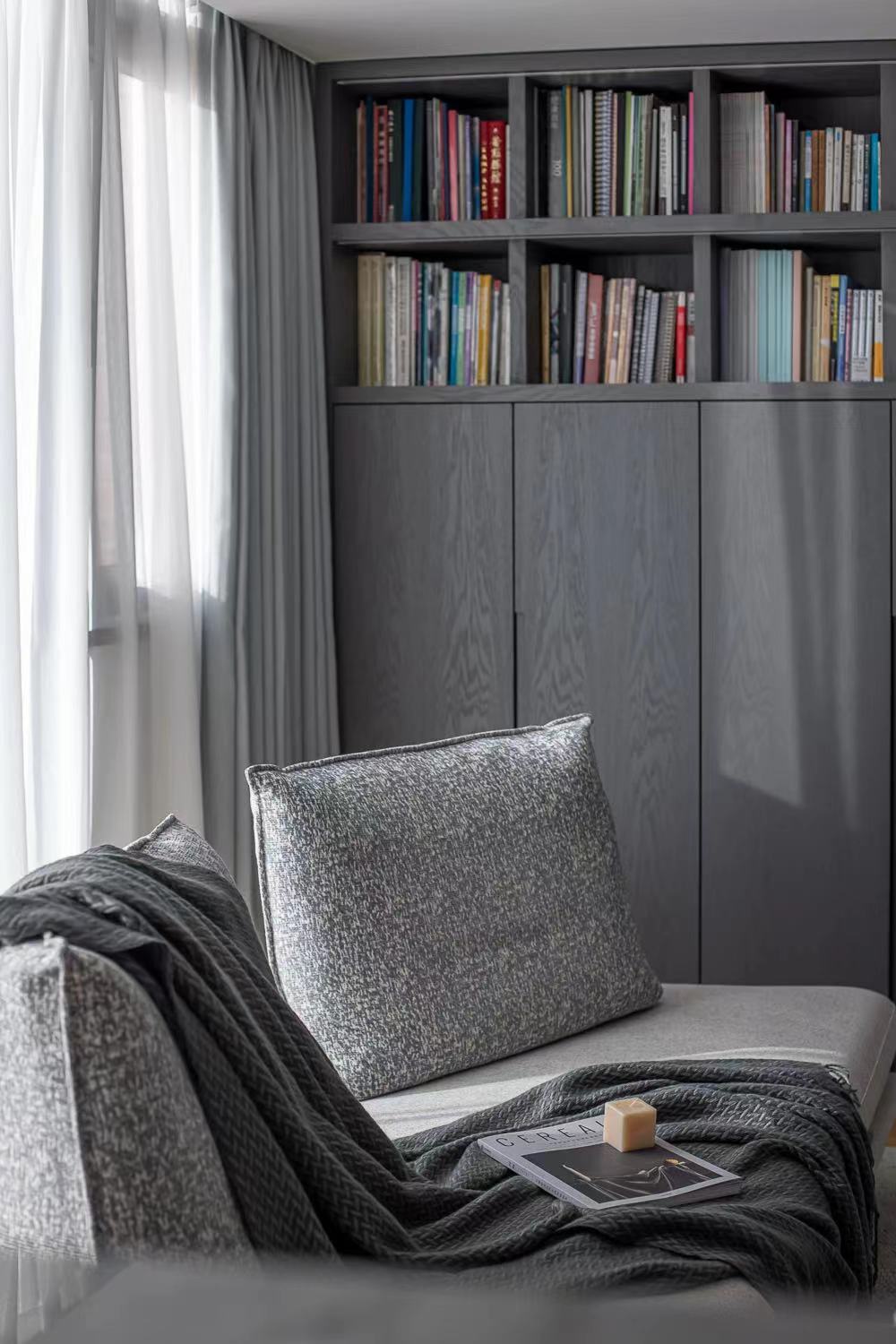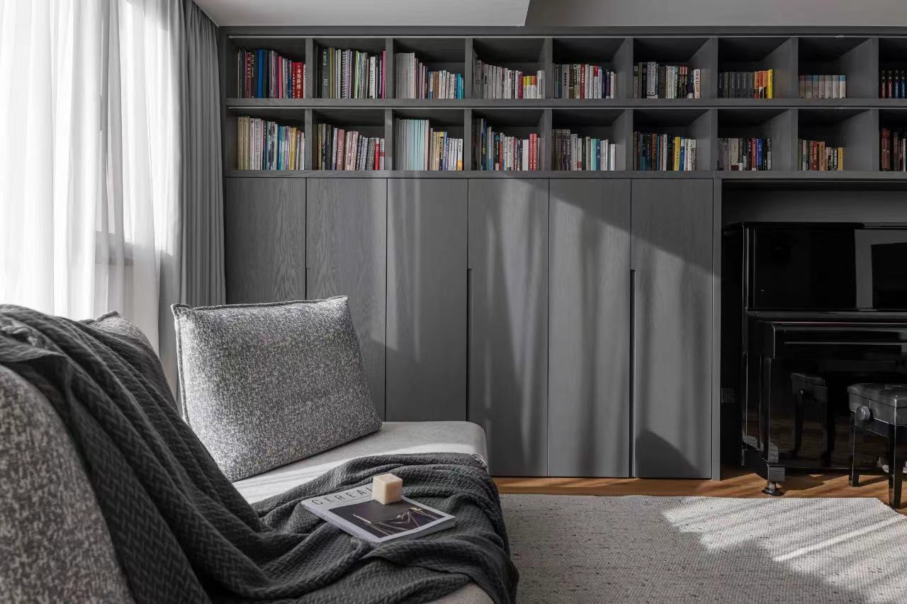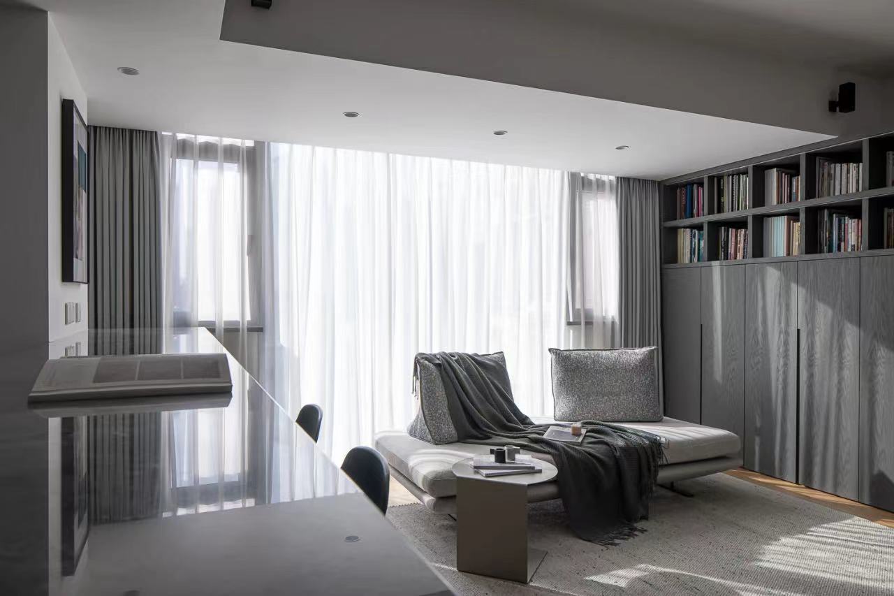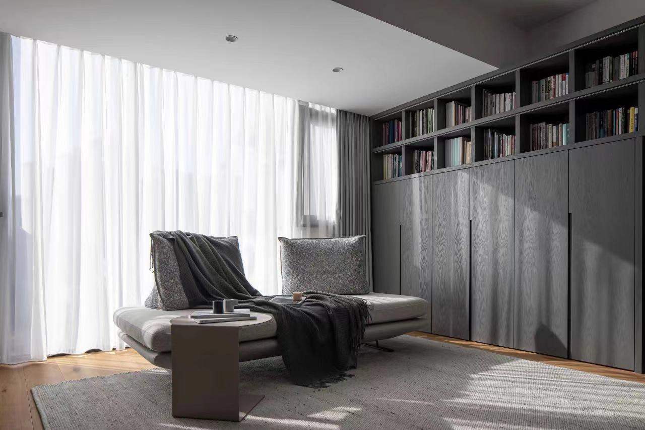 Hope the living room is flexible and changeable, with light side to replace the traditional tea table, leave more space for activities. Wooden cabinet body, with semi-open form, read the books, displayed on the top of the cabinet, hands up convenient to take. An LED light strip embedded below the partition of the open bookshelf is opened at night to give the bookshelf a sense of hierarchy and provide soft light to the living room space.