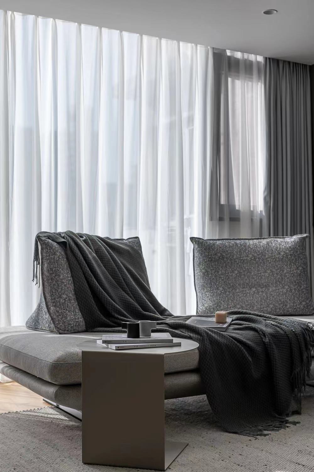 In order to be versatile, choose the sofa with movable backrest in freehand space, without fixed backrest will not block the light in the living room, you can also easily change the direction, lie on the sofa to enjoy the scenery outside the French window, the sunlight in the evening into warm colors bring different color temperature changes to the room.