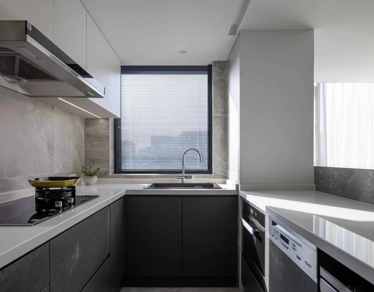U-shaped 5-meter-long kitchen countertop better meets the needs of various cooking and storage. Chinese and Western dishes are arranged on the left and right sides respectively. The use of washing, cutting and burning in the Chinese area is moved. The steamed box, oven, dishwasher and microwave oven are embedded under the western cooking table on the right side, so that different dishes do not interfere with each other.