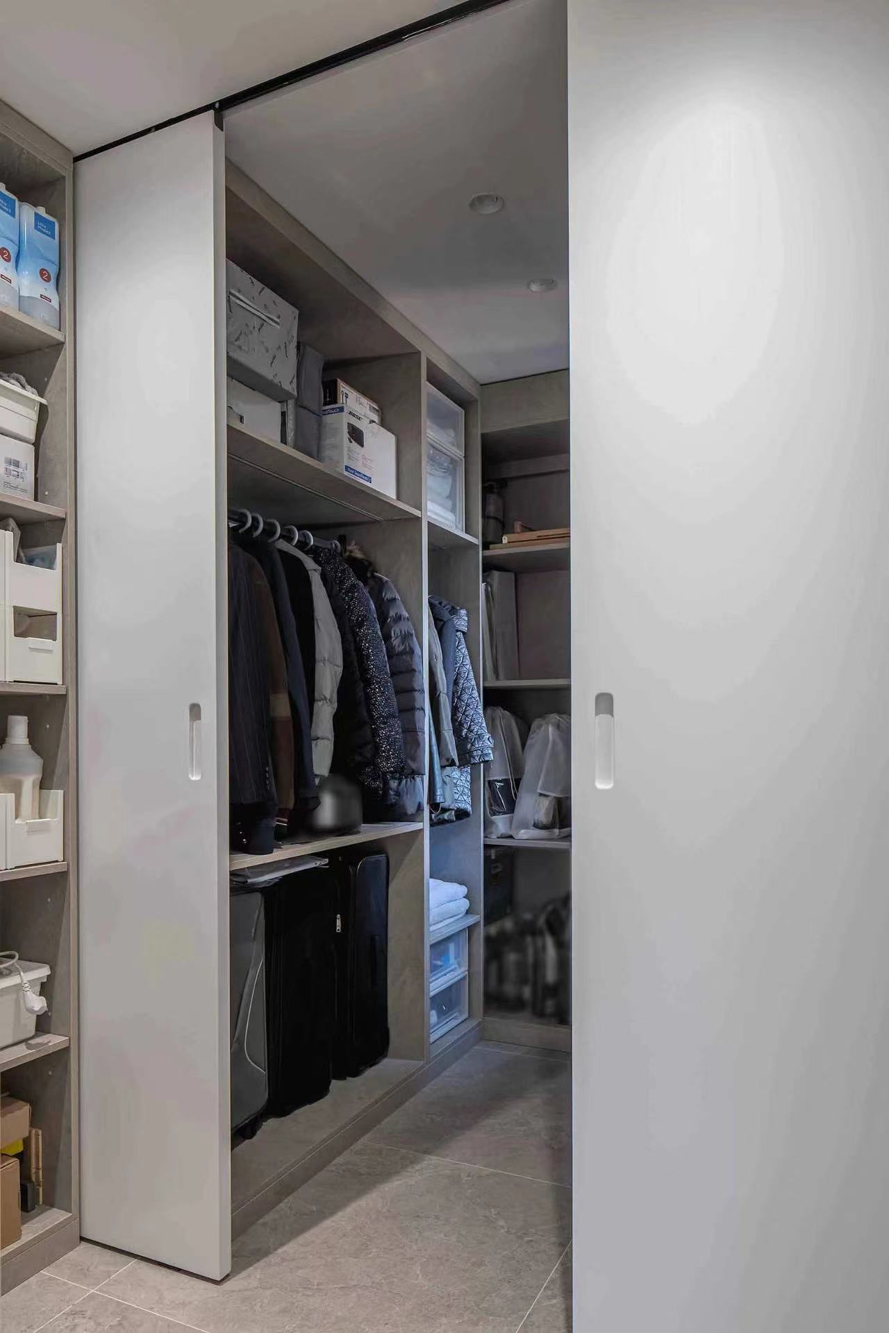 The entrance door is set up in the right invisible door 1.2 meters *1.6 meters about 2 square meters of storage room (unloading area), the internal cabinet is set 350mm and 550mm deep two specifications of the cabinet can meet the different sizes of the items, such as coats, bags, express, go out to carry sports equipment, to ensure the entrance hall smooth, clean, orderly.