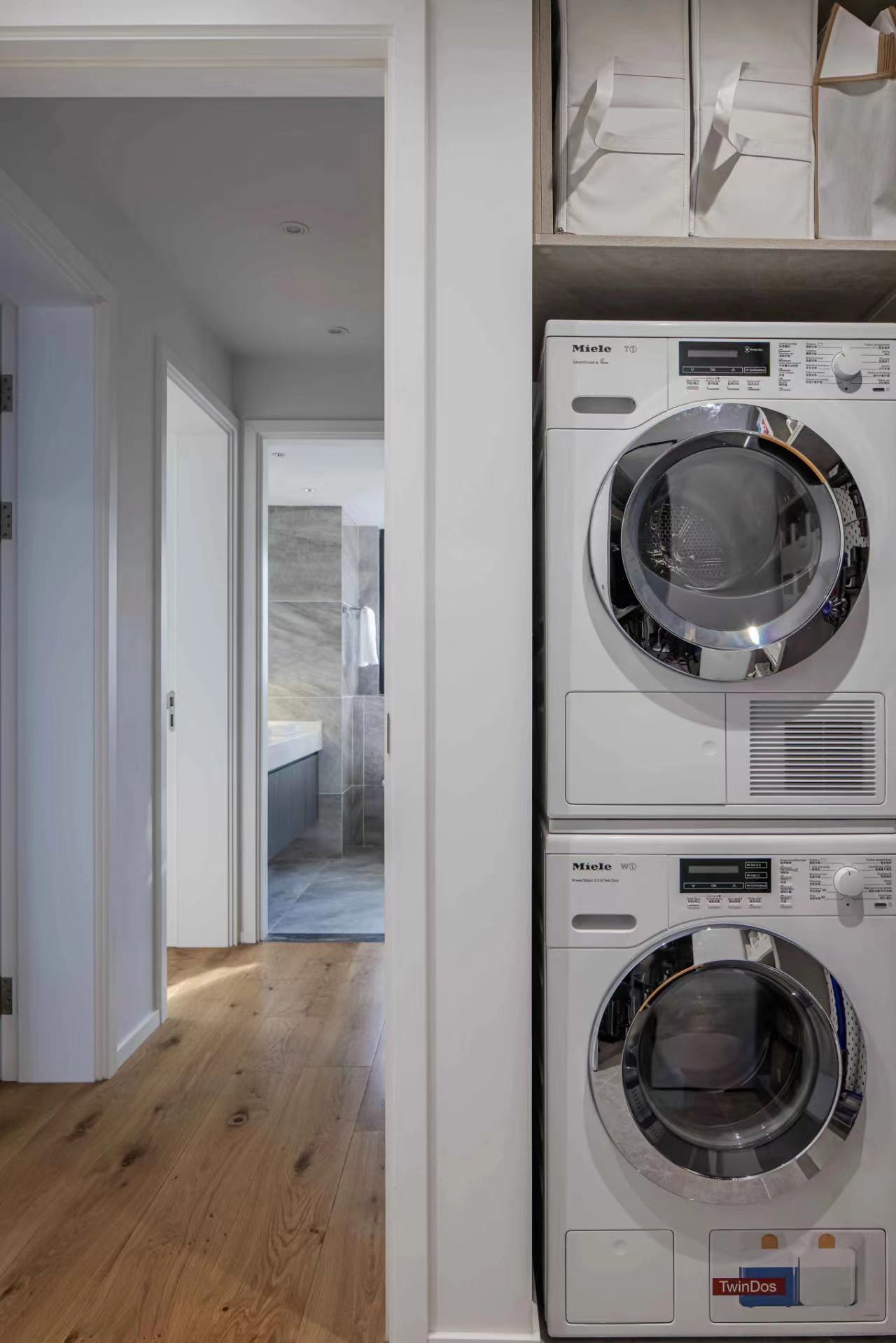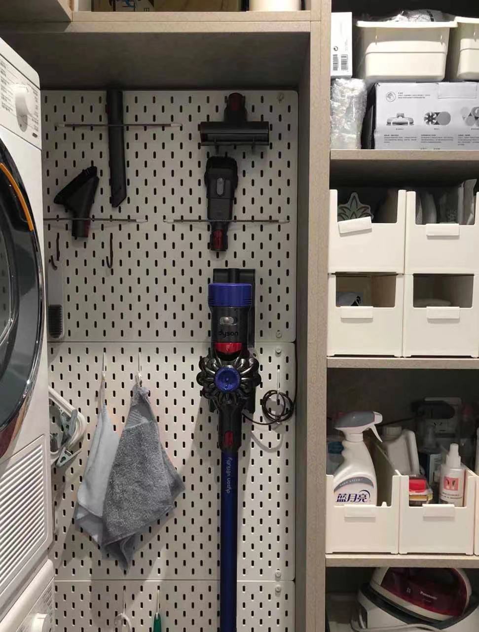 外部洗衣间设置开放式壁柜,日用品储存便于拿取。洗衣机烘干机嵌入在柜体中间,侧面空间使用洞洞板,也可高效收纳家里的吸尘器等清洁工具。洗衣+烘衣+储存收纳,一步到位后,阳台面积也得到解放。