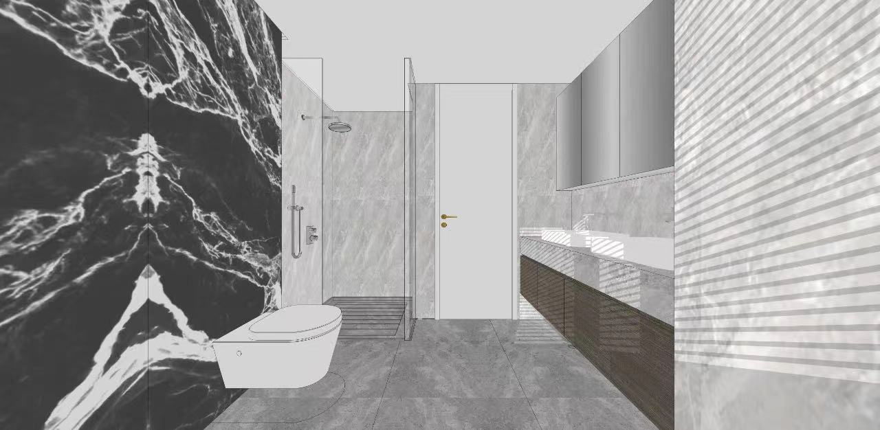 将淋浴房内嵌藏于门后侧,较为隐蔽,淋浴房地面使用大理石拉槽处理保证整体感的情况下达到防滑效果!