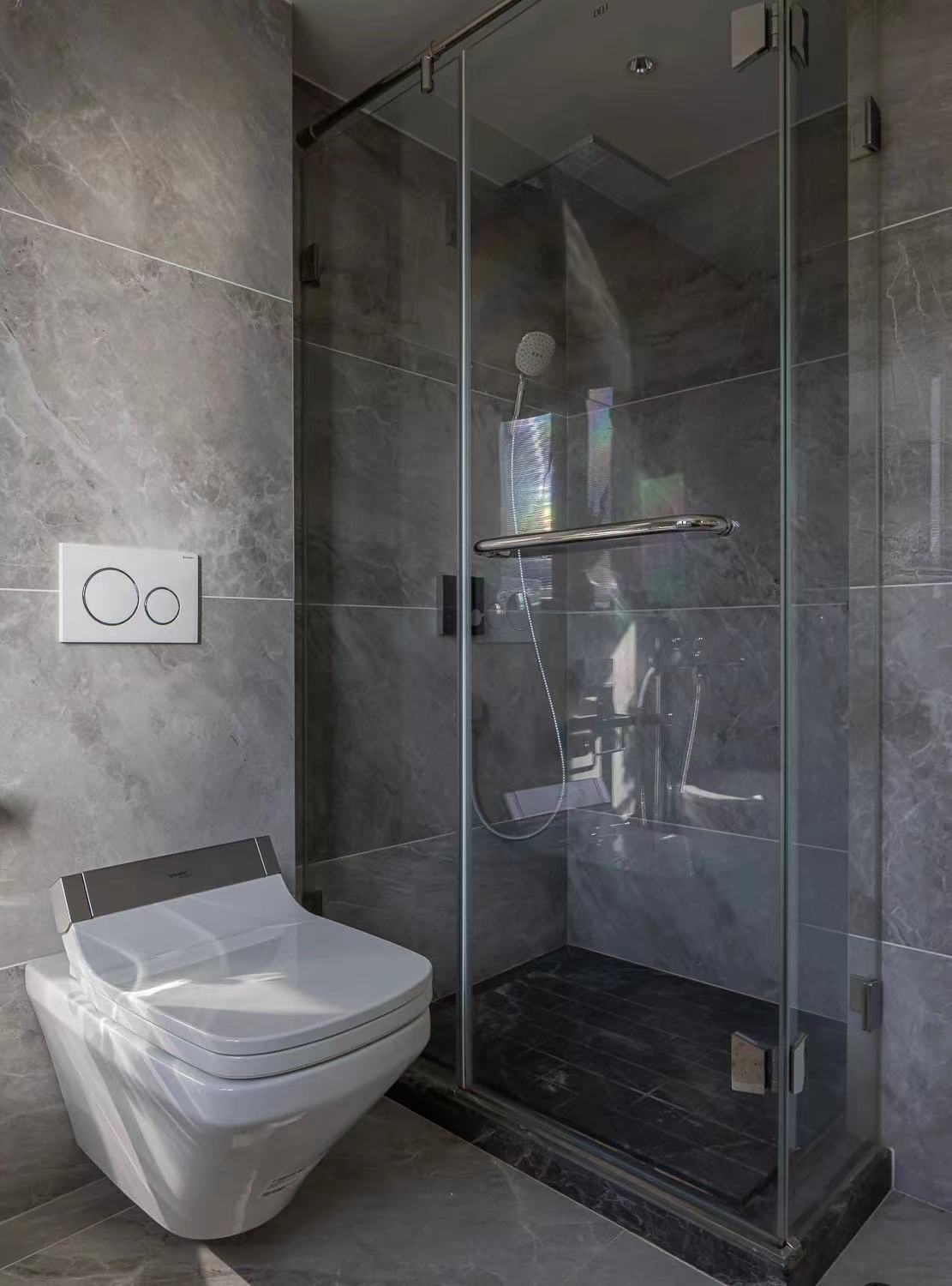 The shower room embedded in the door behind the side, more hidden, shower room floor using marble groove treatment to ensure the overall sense of the situation to achieve non-slip effect!