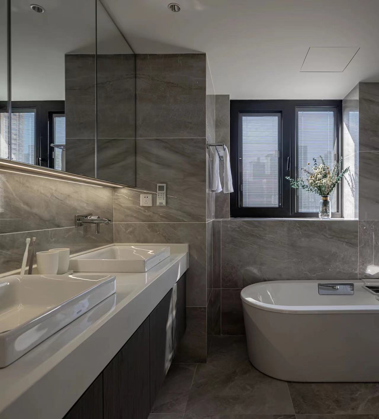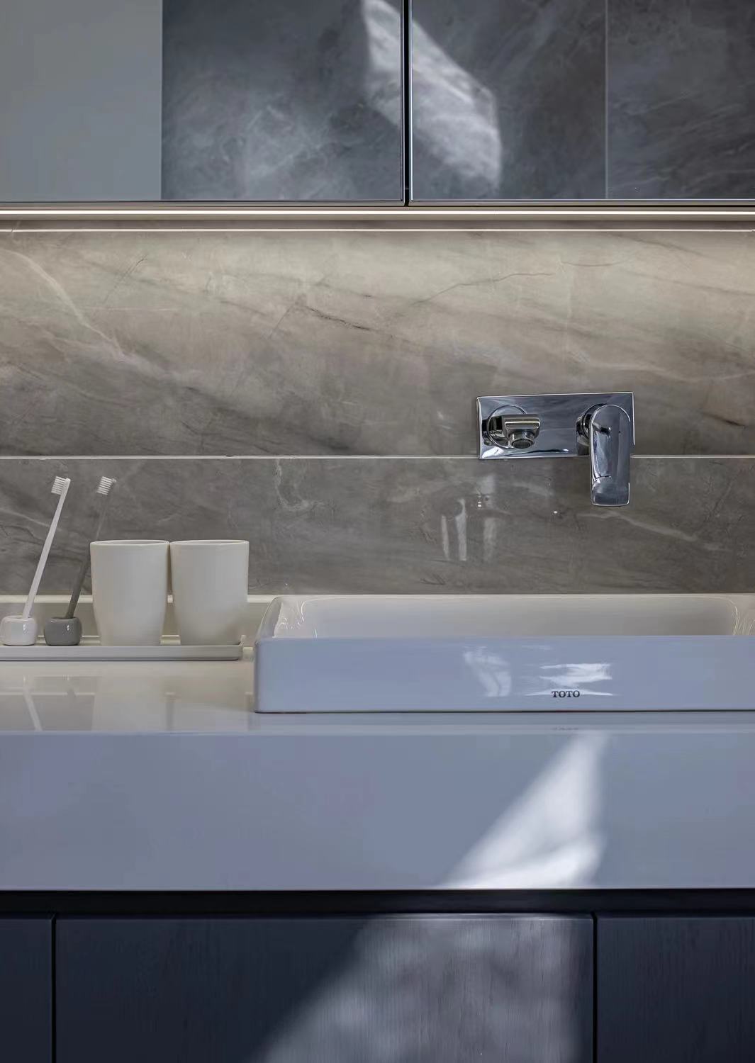 The basin area is pushed 350mm to the direction of the master bedroom to form an embedded double basin location, which can be used by 2 people at the same time in morning peak. To keep the table clean, a mirror cabinet is set up above, where toothbrushes and nursing supplies can be placed. In addition, a power supply is set up in the mirror cabinet, which can provide electric toothbrush for charging use.