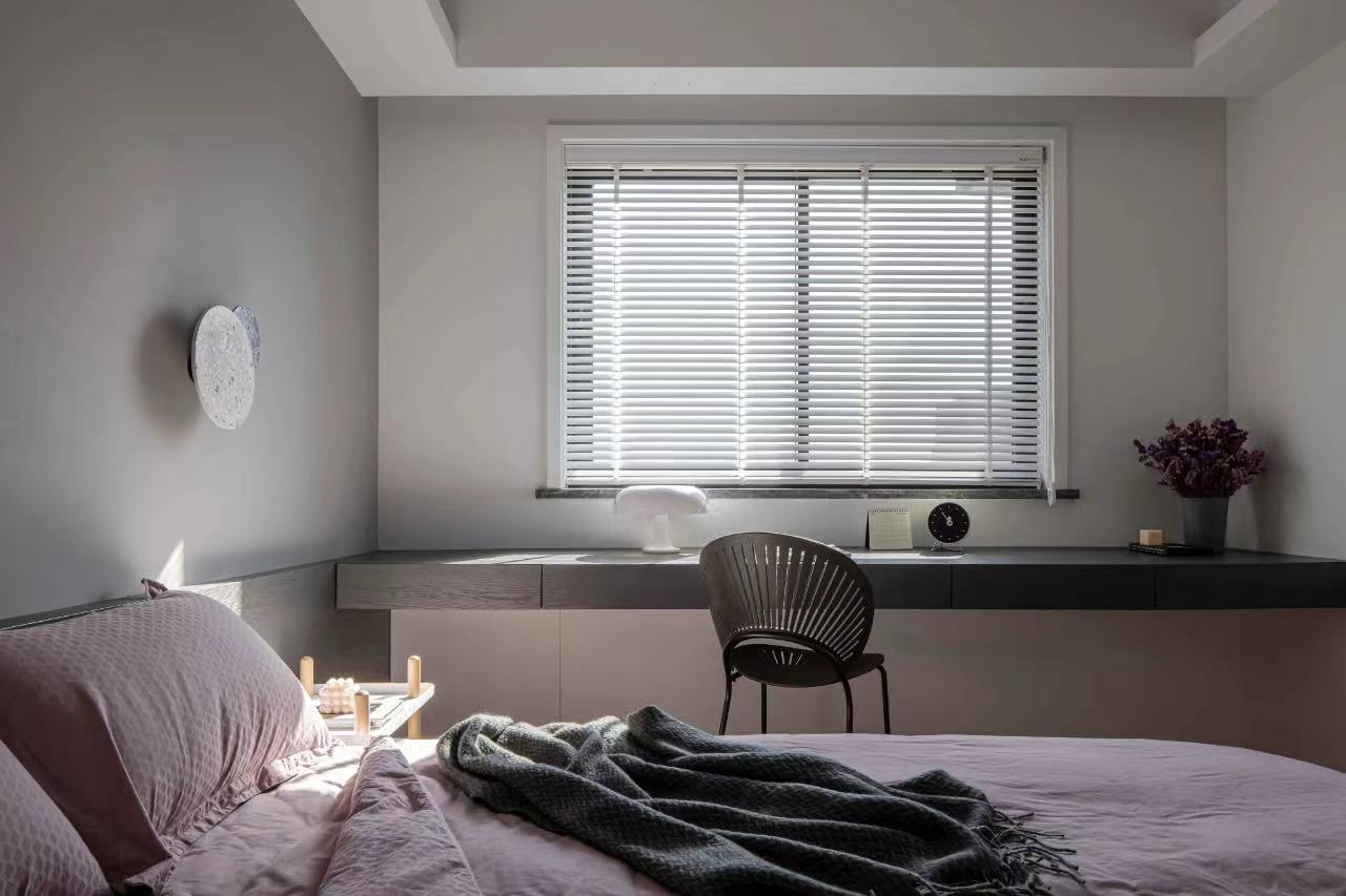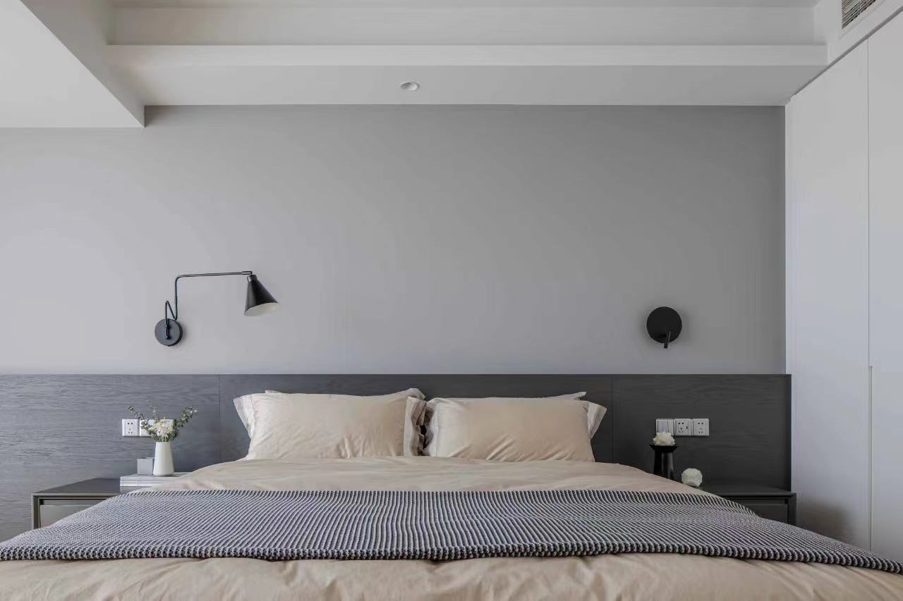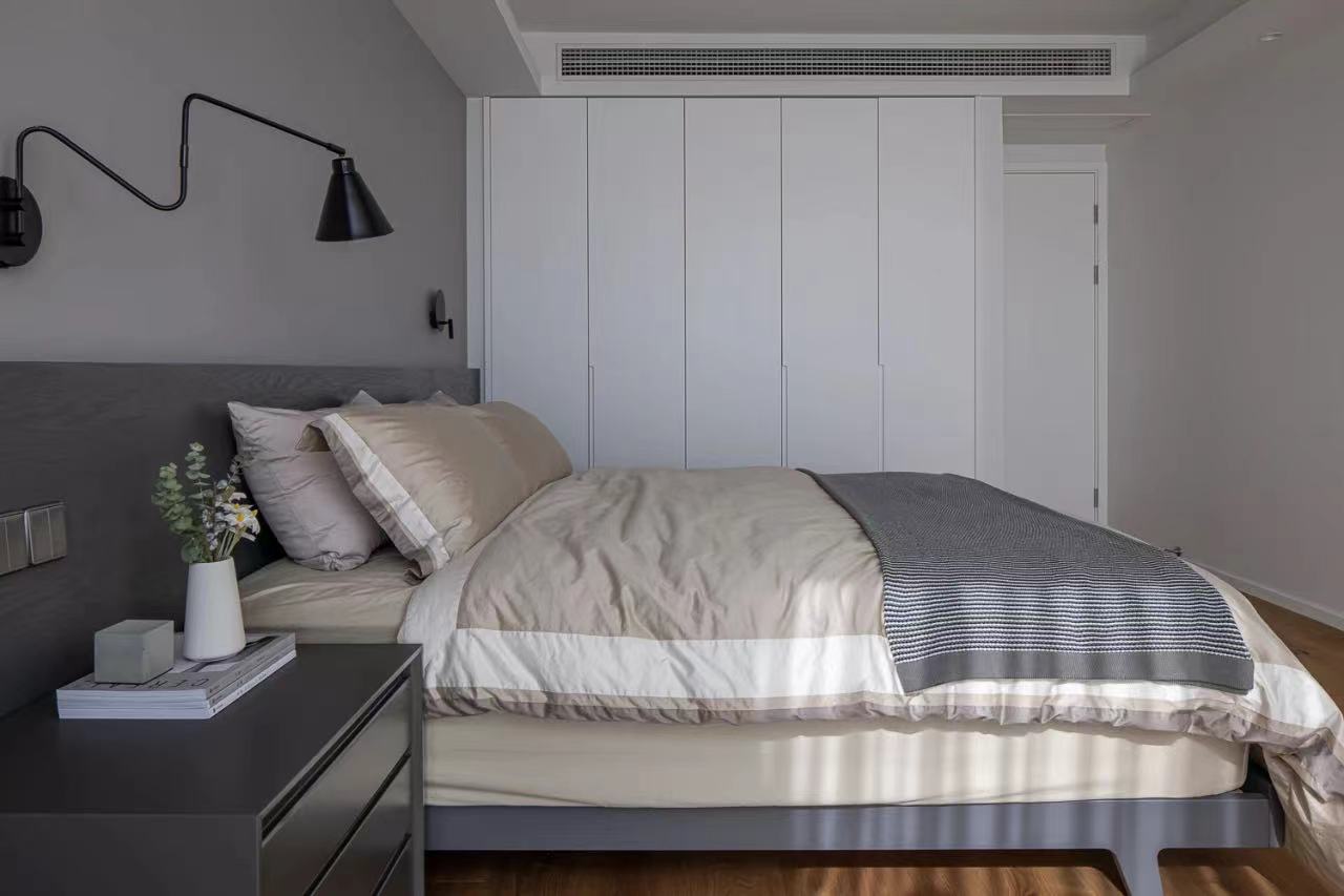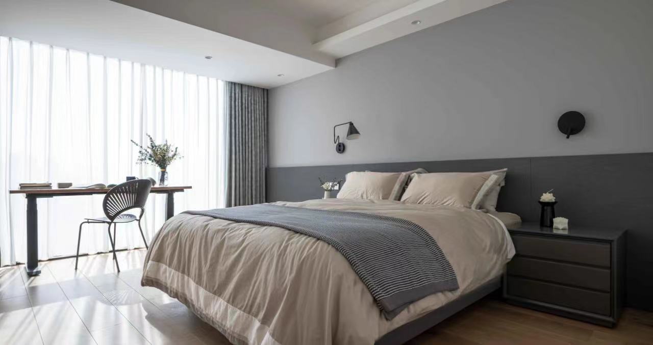 主卧室,将原阳台打通,灰色一字型床头板延展过去,加深空间的纵深感。