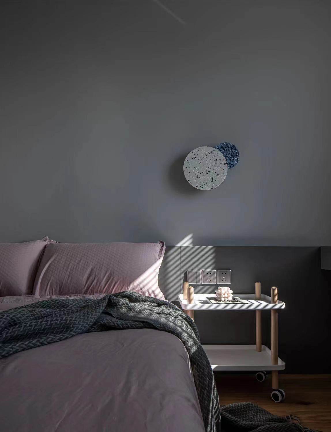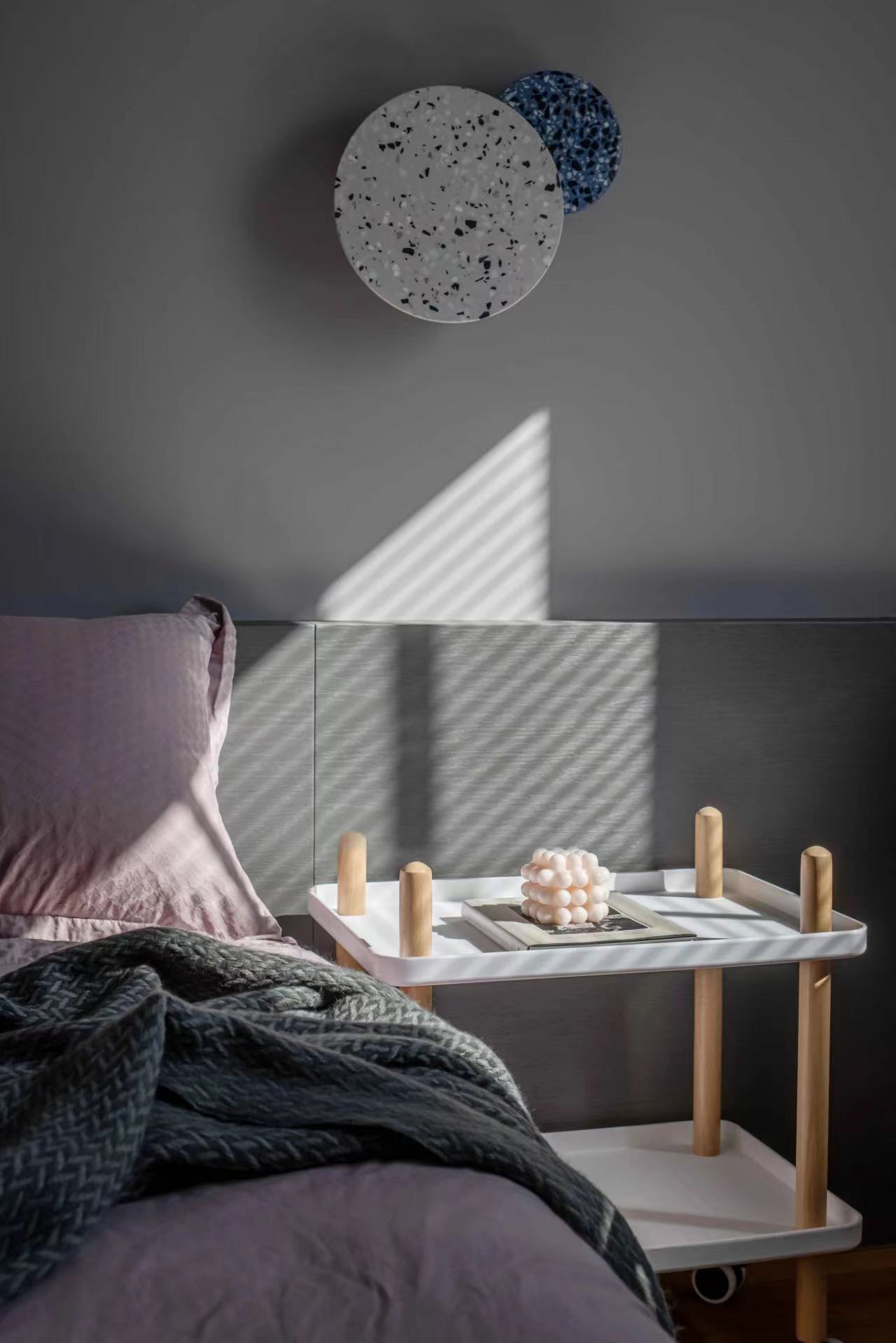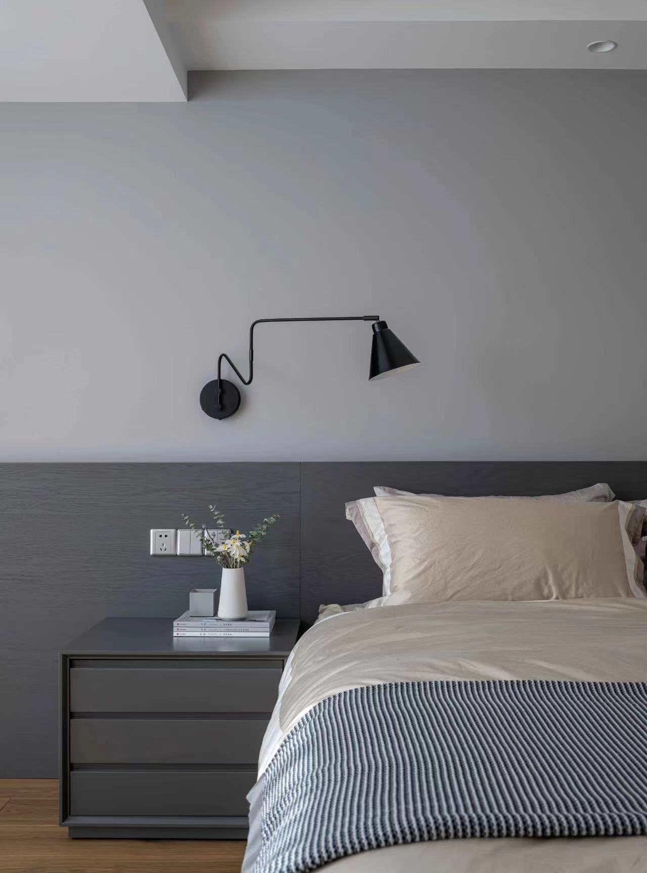 不规则的床头壁灯,可以任意调整高矮、方向,睡前阅读,灯光改变方向也不会影响枕边人。