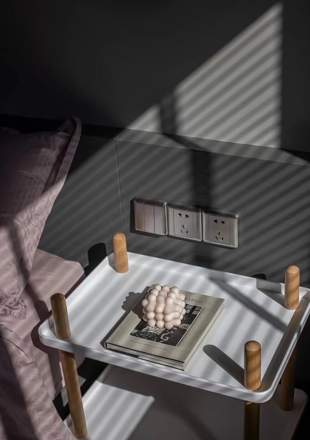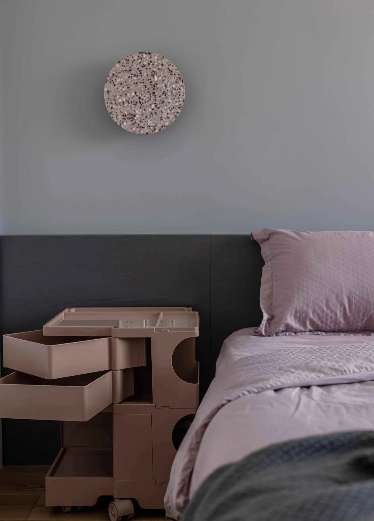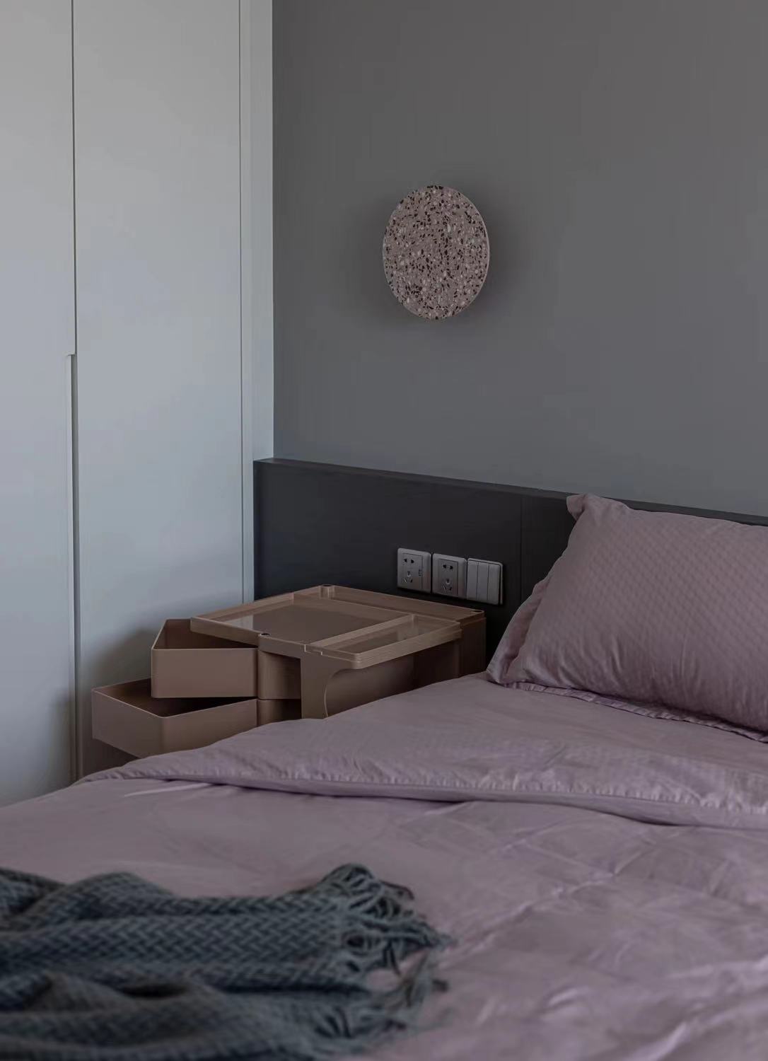 不规则的床头壁灯,可以任意调整高矮、方向,睡前阅读,灯光改变方向也不会影响枕边人。