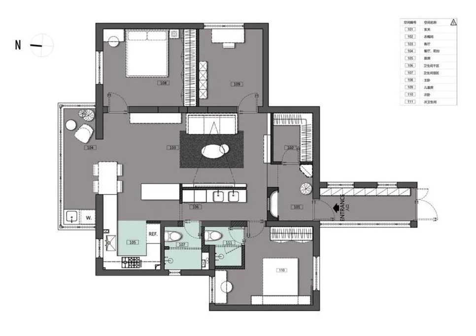 1.增设玄关,隐私保护同时增强仪式感 ,右侧改暗卧为衣帽间,归家“卸货”收纳充足;