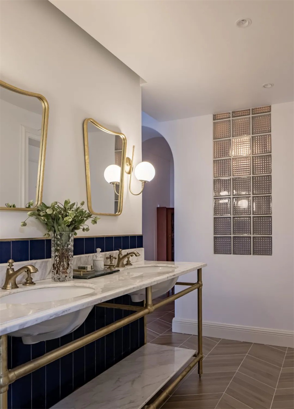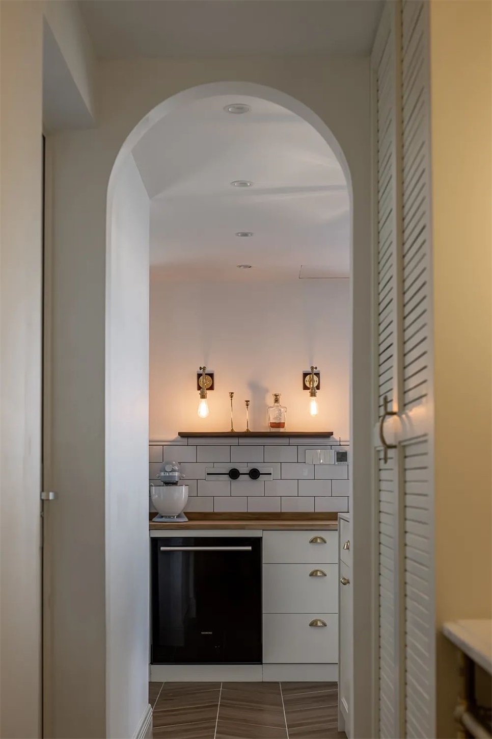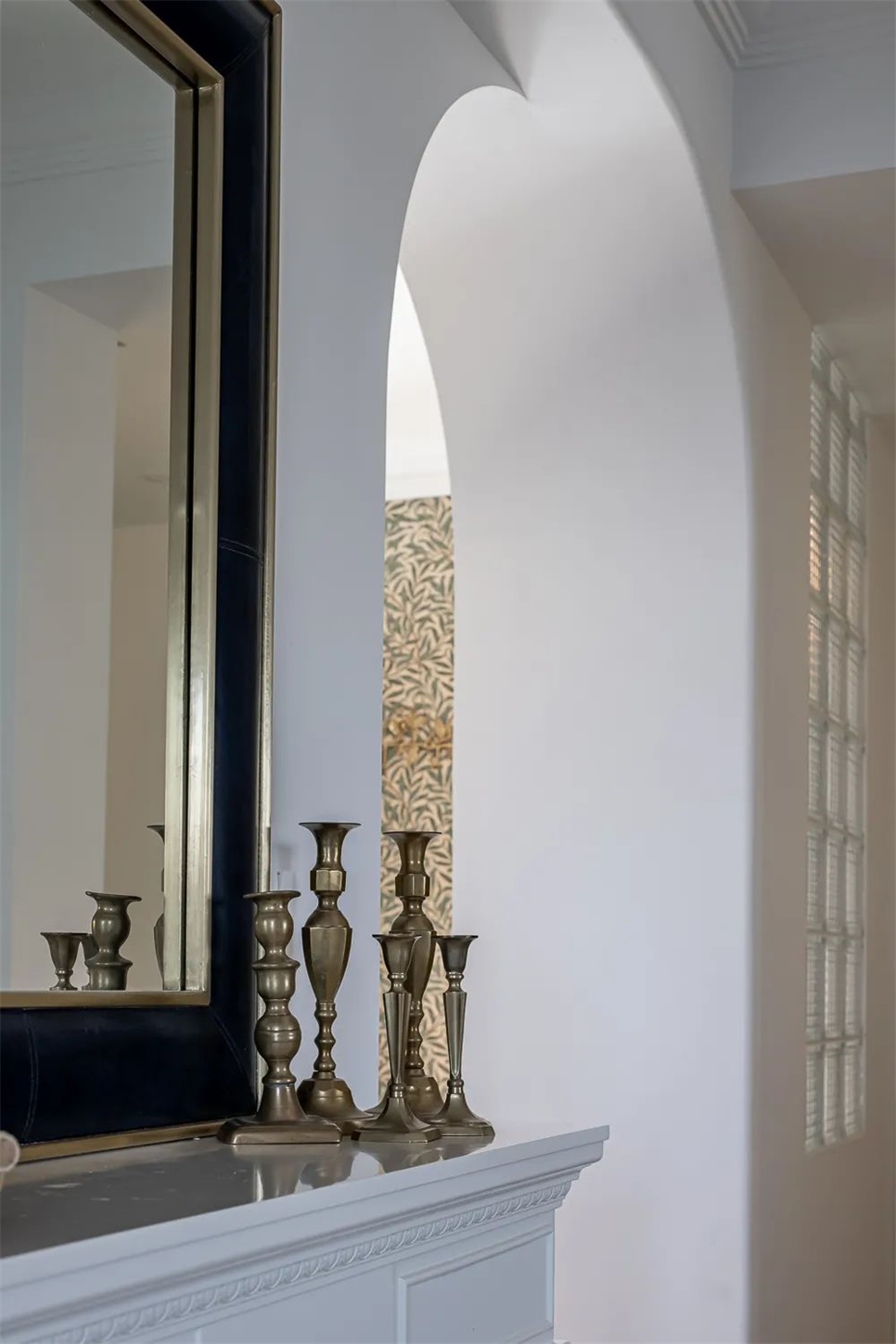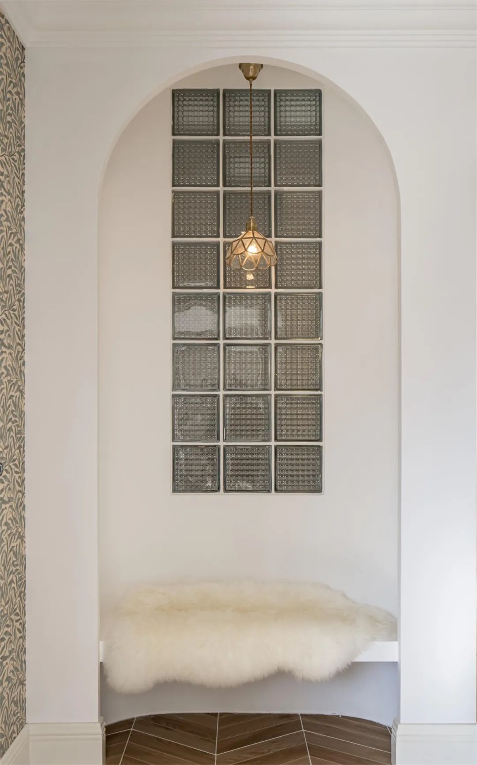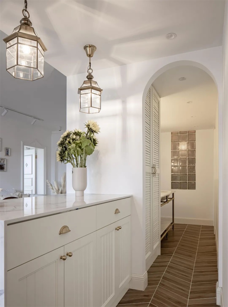 玄关隔断采用拱与透光砖元素。