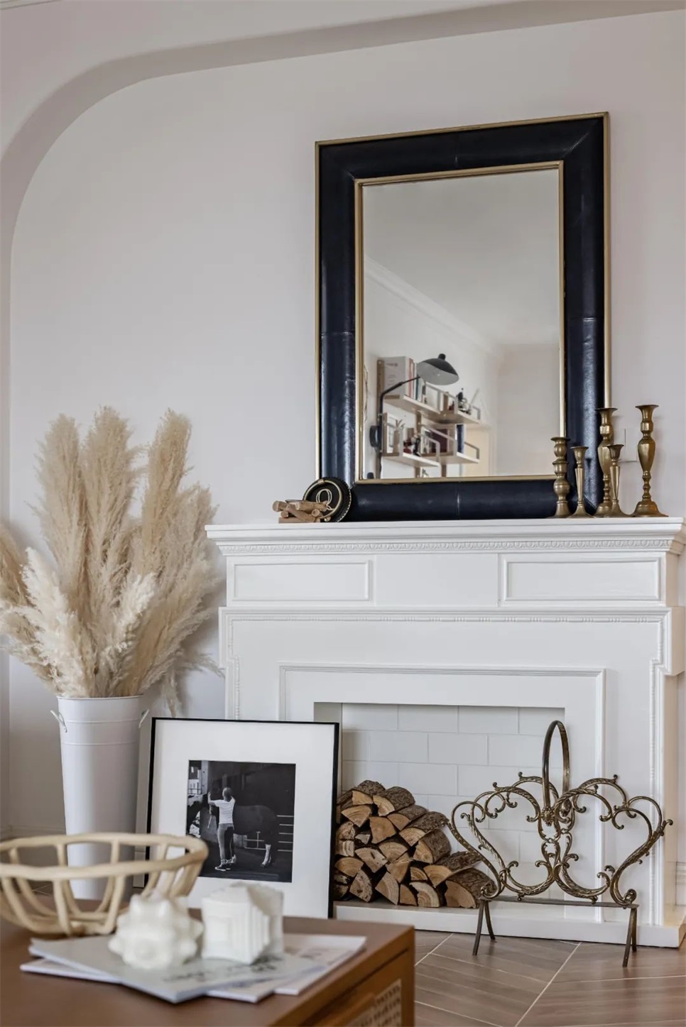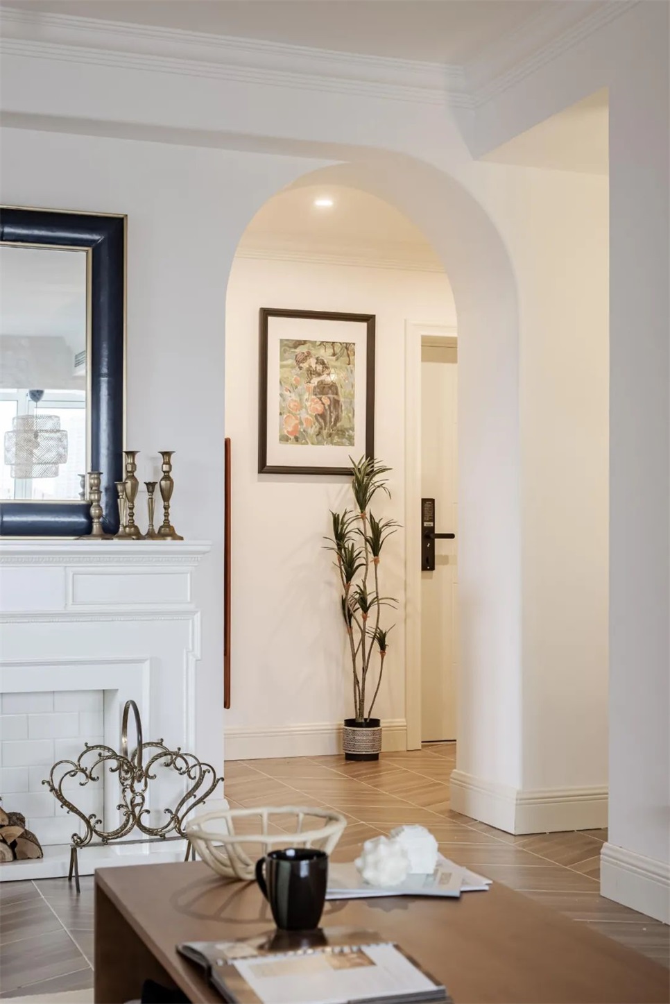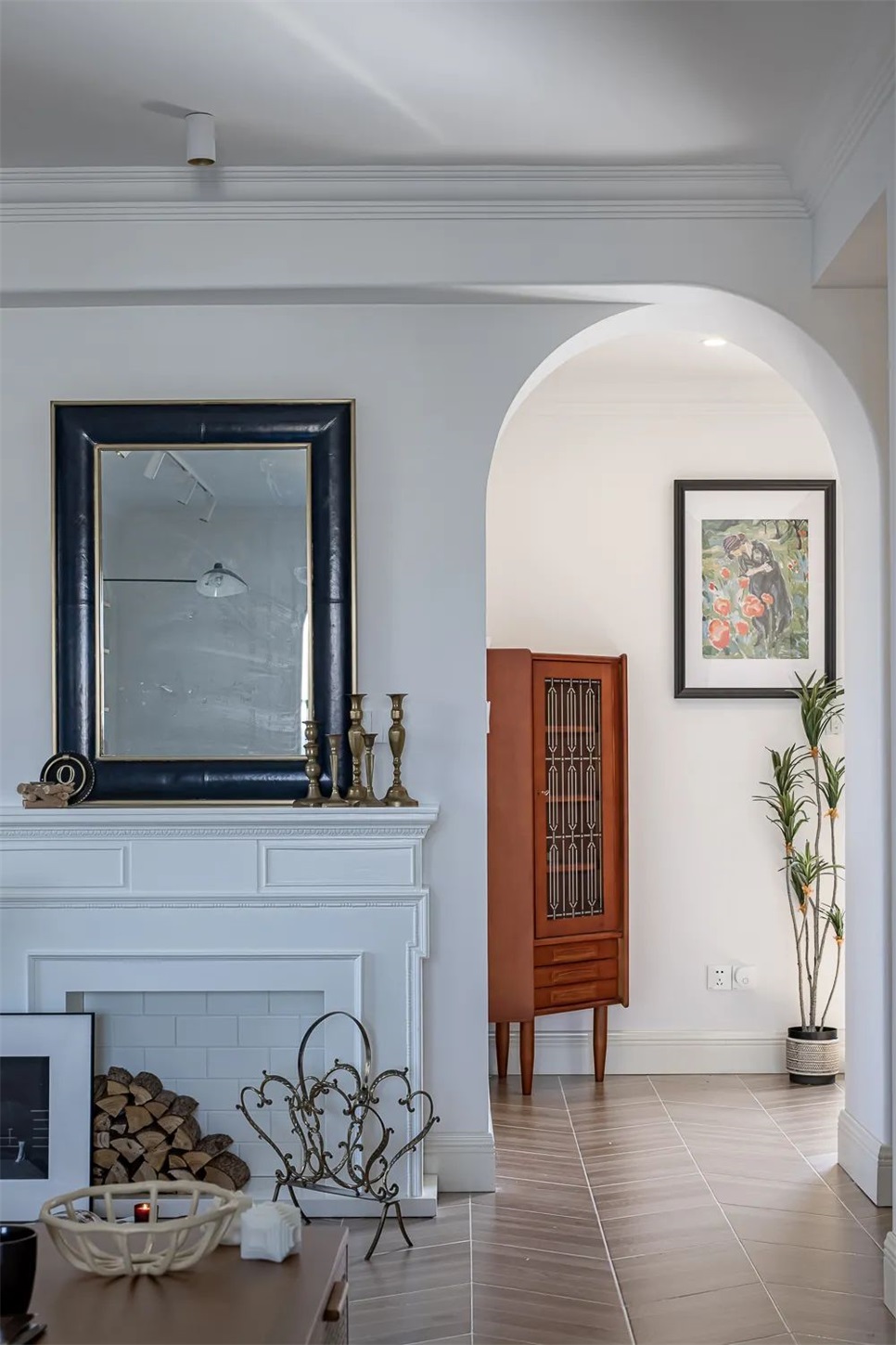 壁炉后侧是玄关储物间,外侧设置了MCM风格的三腿角柜,这里面放置的是夫妇俩从各个国家旅游带回来的纪念品,出门归家路过提示着幸福的过往。