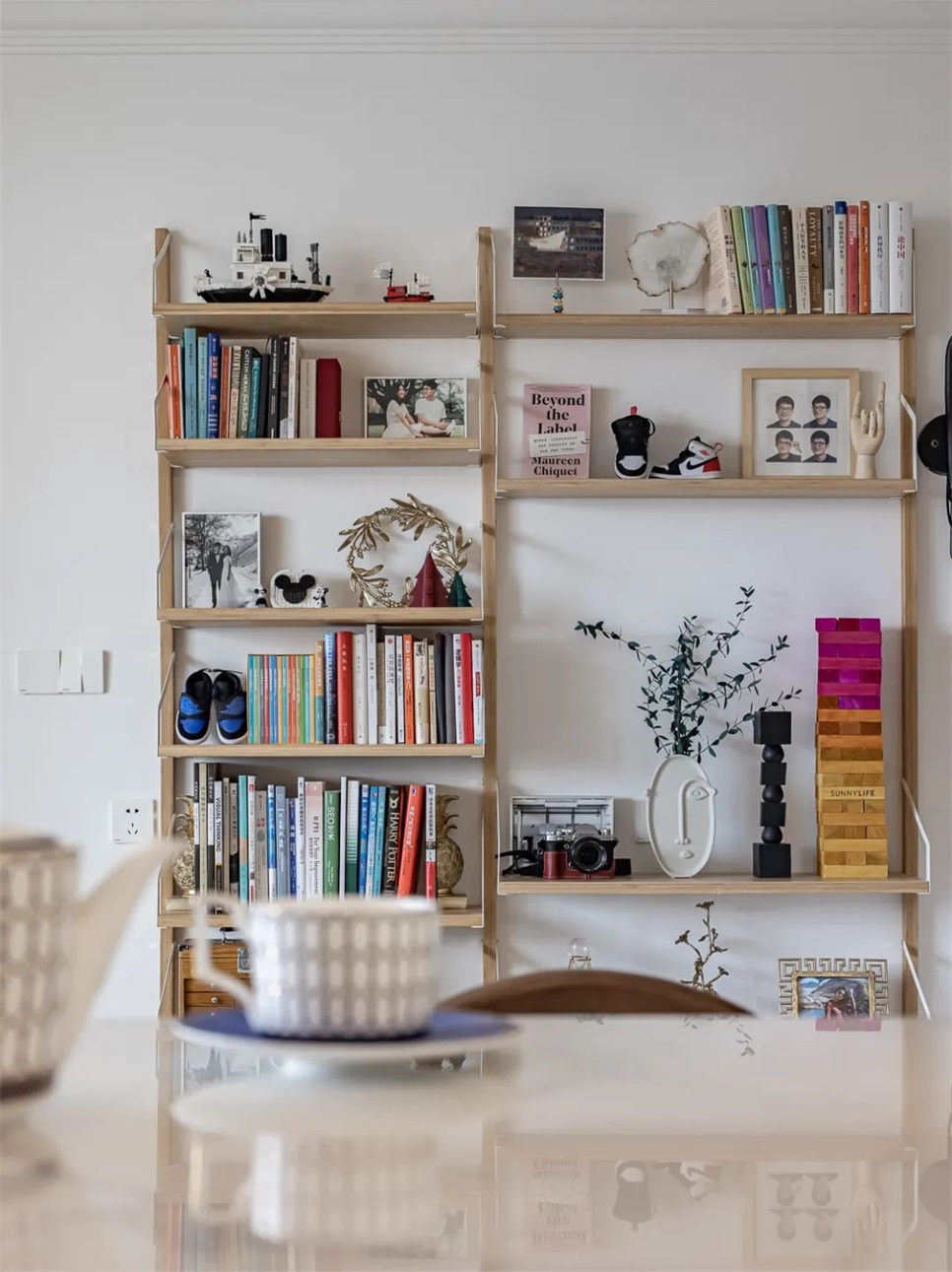隔板书架上,是夫妇俩人在外求学时房子里的装饰物品,在新家里也给它们留出了位置。