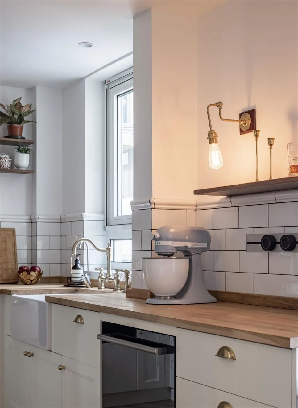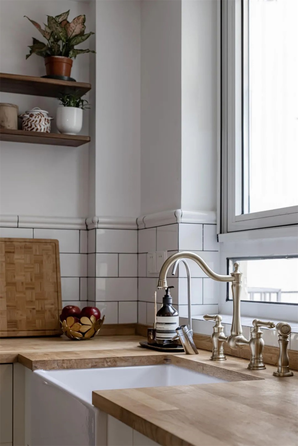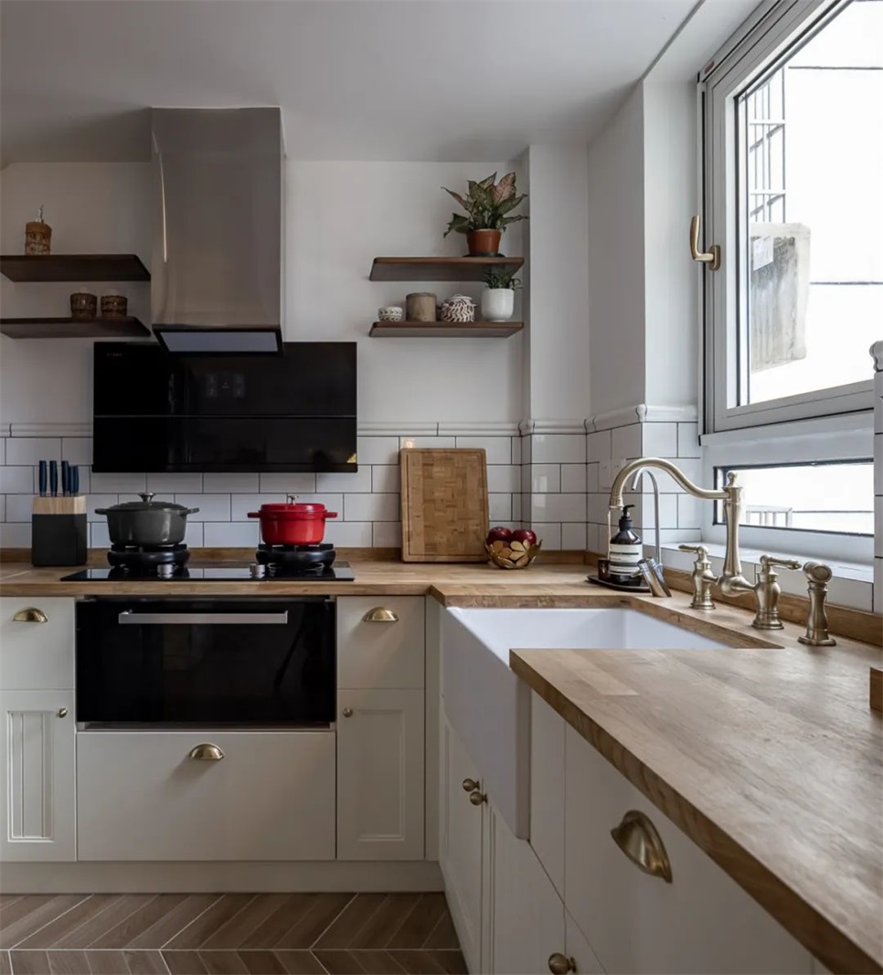 洗涤区,纯手工的英伦复古风水龙头,和Farm house sink是业主夫妇全屋最喜欢的部分,在木制台面的衬托下,恍惚间仿佛回到了念书那会的旧时光。