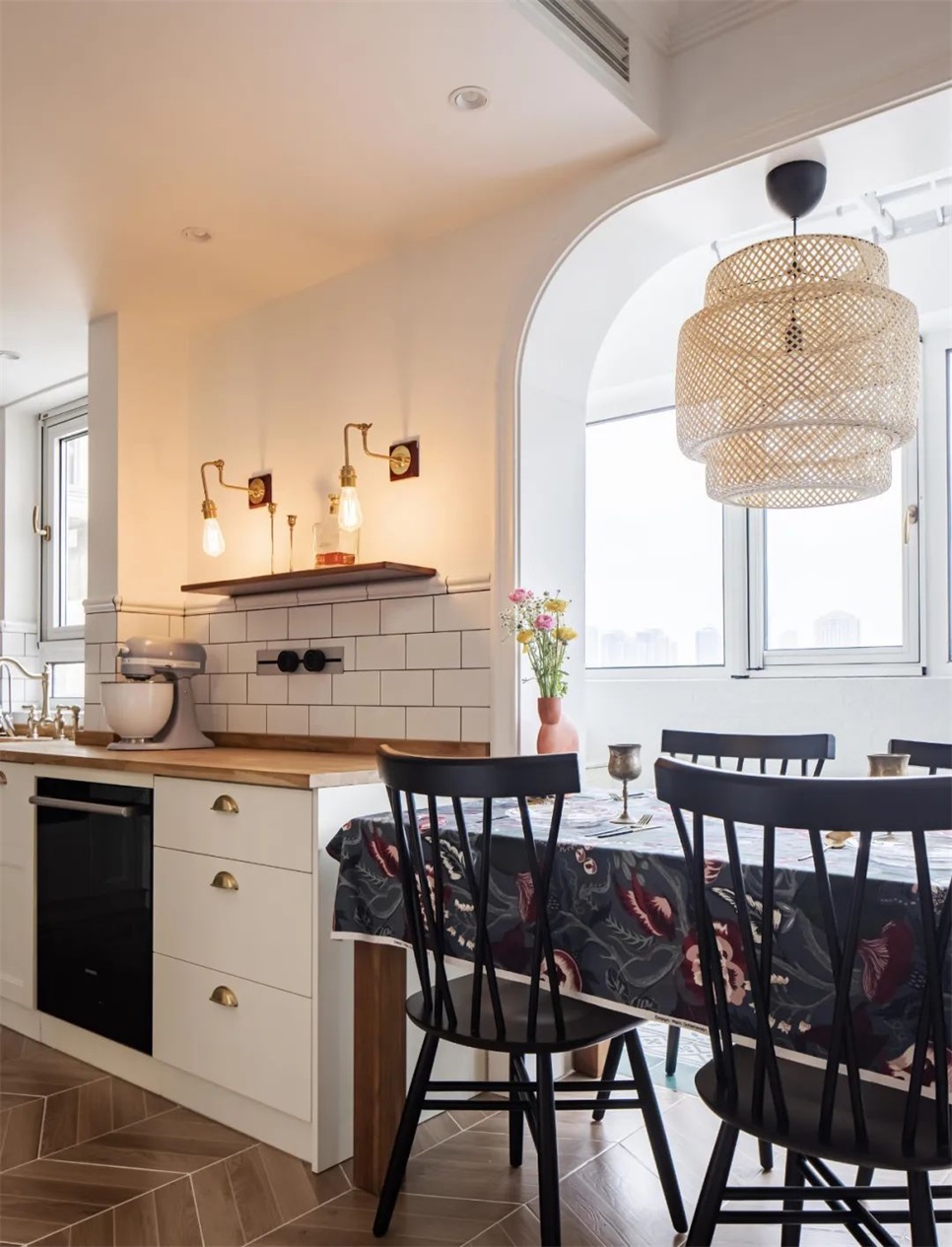 延展出来的橱柜,配合岛台做成了西厨备餐区;橱柜下方嵌入了洗碗机,临近餐桌,除了洗涤餐具非常便捷,柜体内部也做足了收纳,也可兼职餐边柜。
