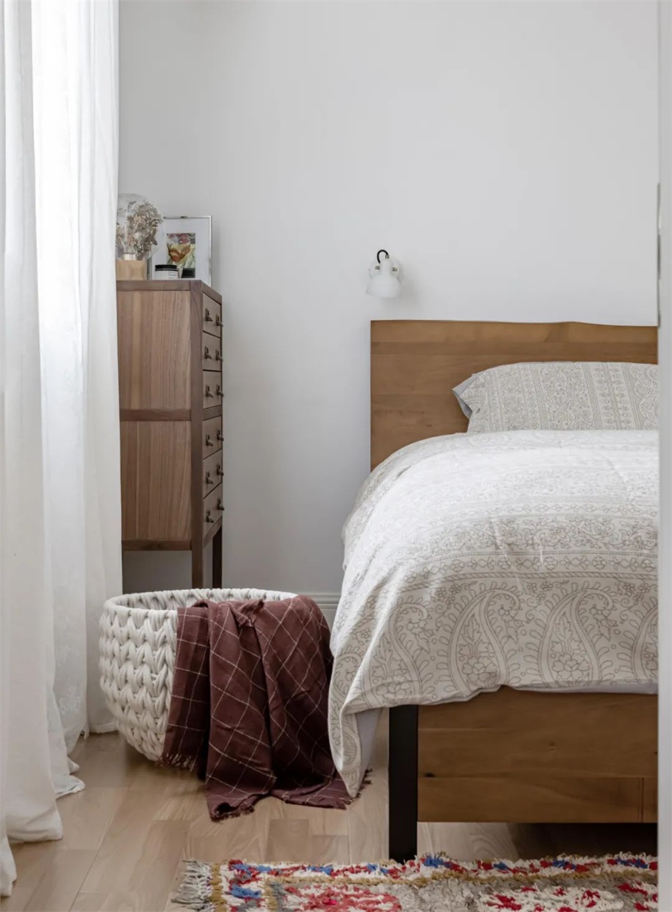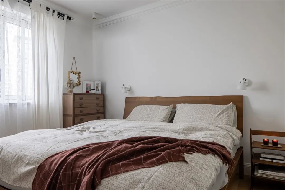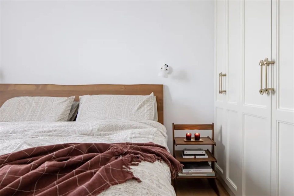 主卧和客厅一样,清爽的白色打底,除了定制柜,选用的活动家具:床、斗柜、杂志架床头柜,都采用的胡桃木材质,增添空间质感。