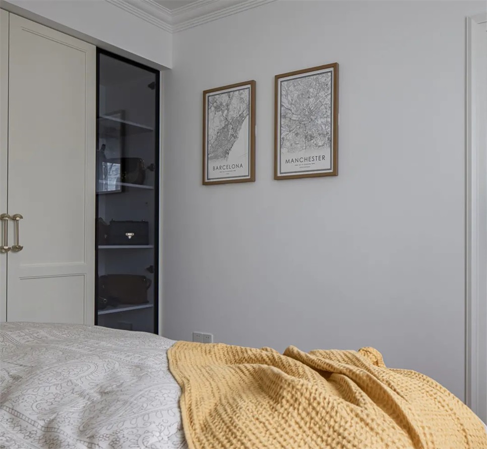 墙壁上的地图装饰画是夫妇俩早年间分别生活的城市,西班牙的巴塞罗那与英国的曼彻斯特,挂在了卧室,留作纪念。