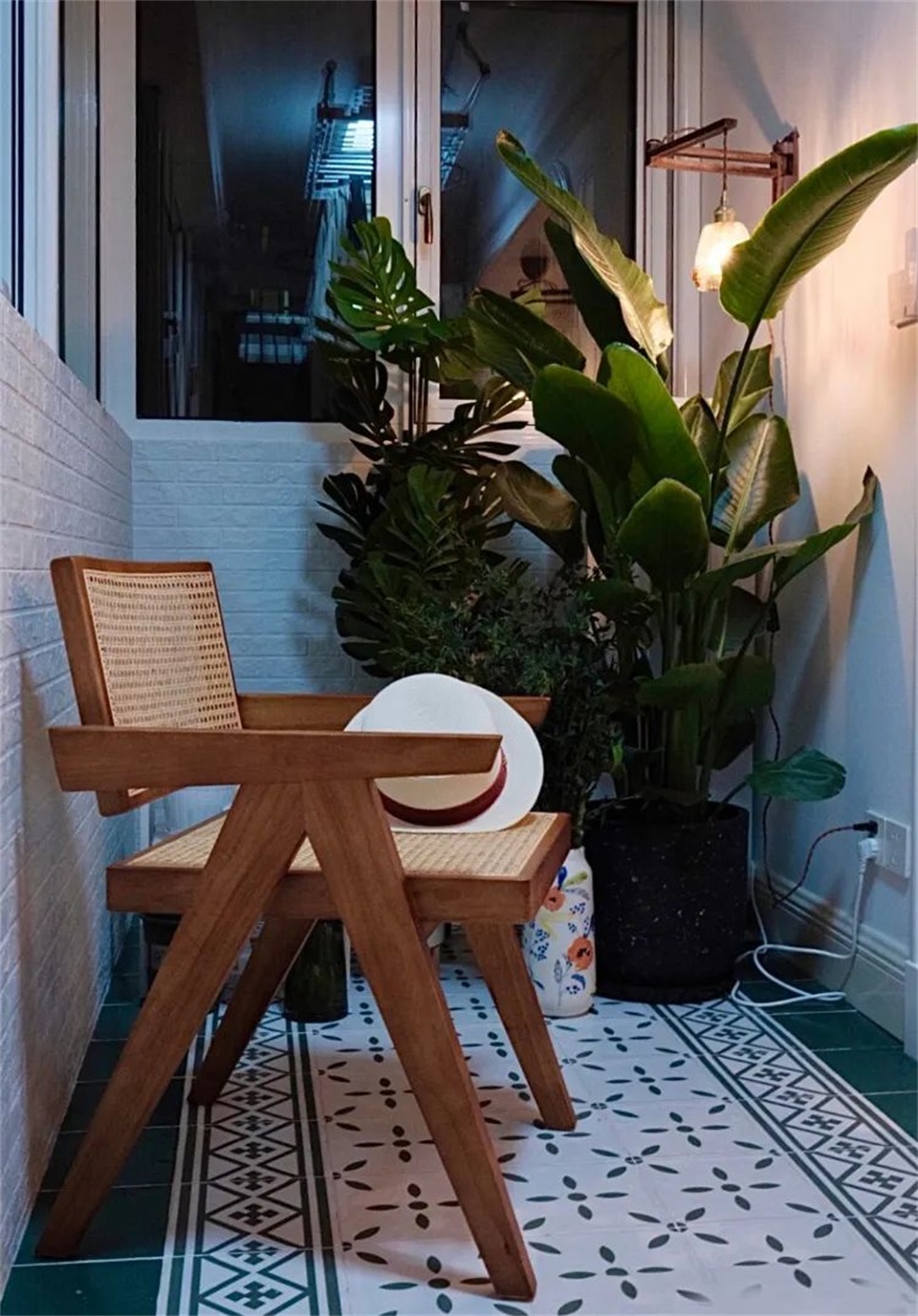 阳台区域,除了部分作为晾衣区,一侧做了绿植。铺装了绿色的小花砖,夏日的夜晚一把昌迪加尔椅子,在阳台纳凉也非常浪漫!