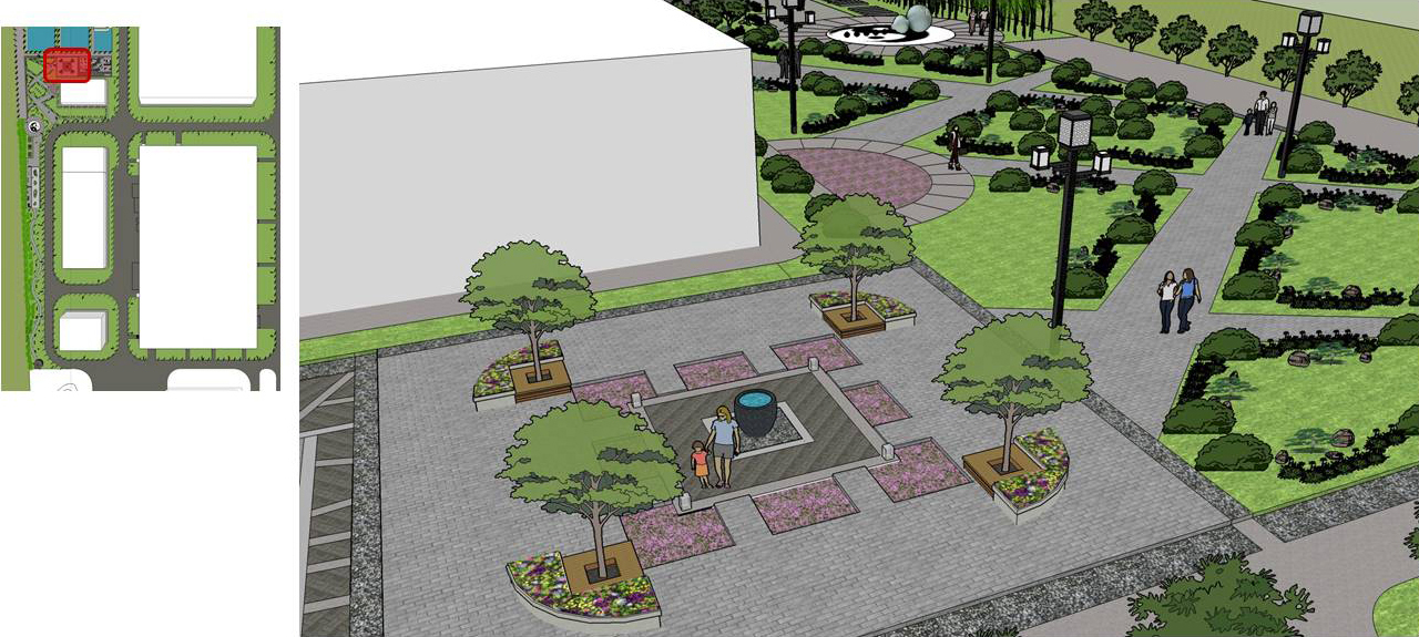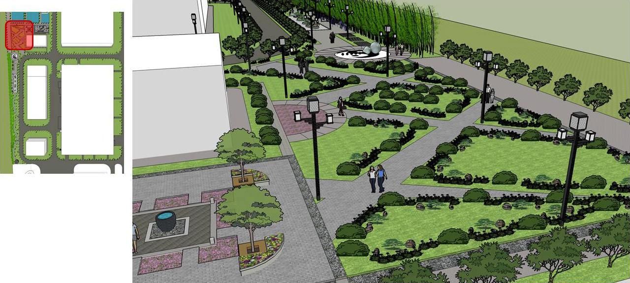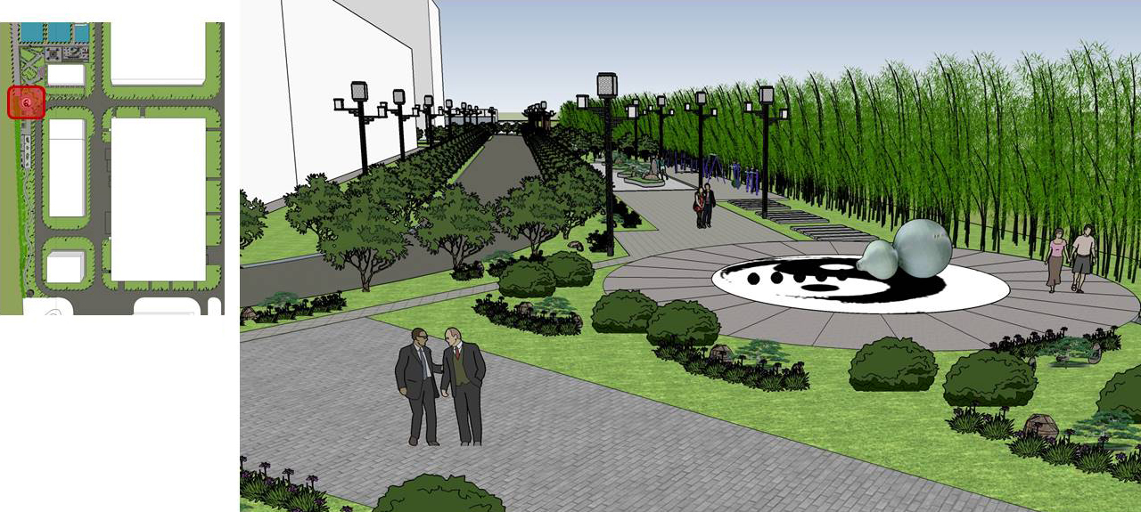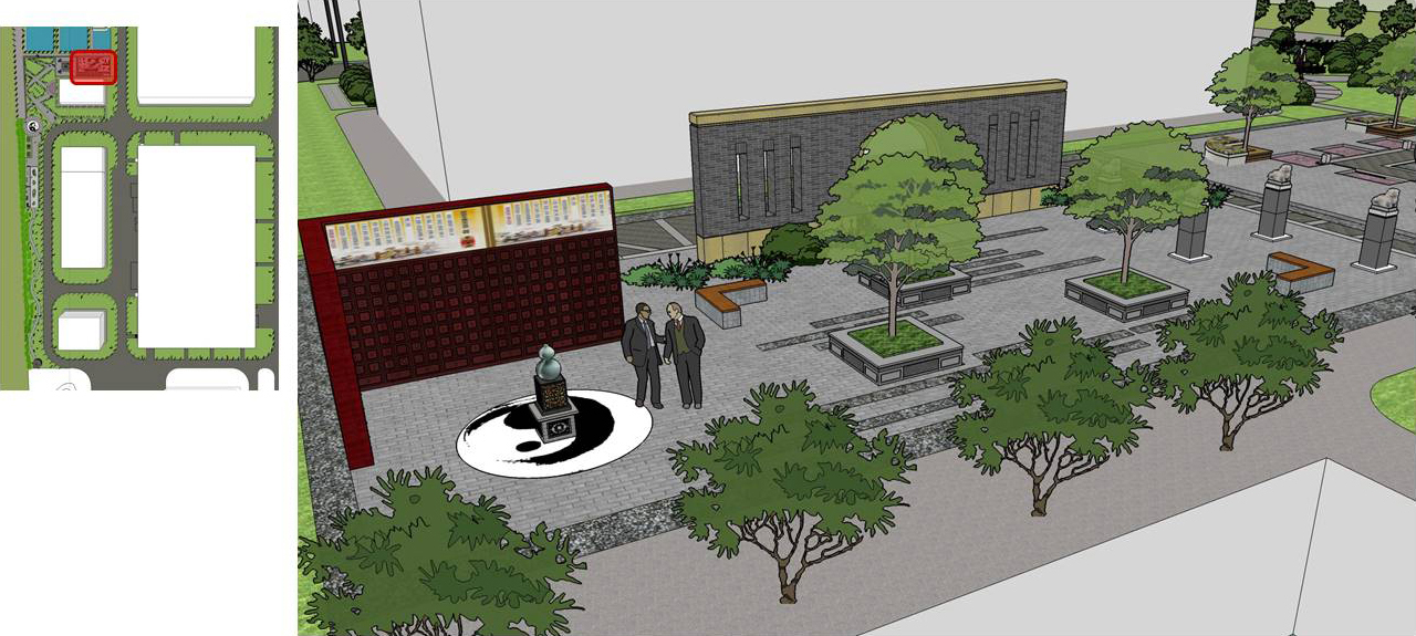 饮水思源、中药创新、笃行致远;天人同序、乾坤济世;集百草要让这世界都香。三主广场、一核心景观轴线、寓意过去、现在、未来。两翼侧广场,寓意有主有次、比翼双飞。多景观支路网联通各个核心广场,寓意本草纲目、犹如人体经络、四通八达、舒展通畅,蒸蒸日上。