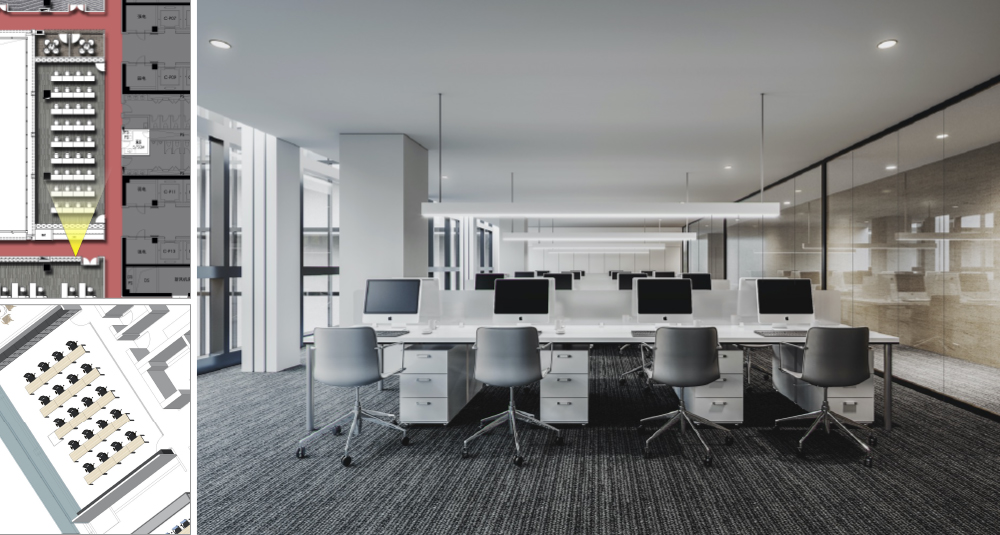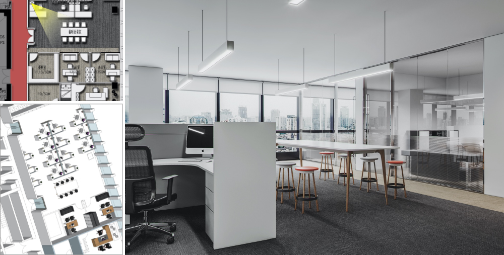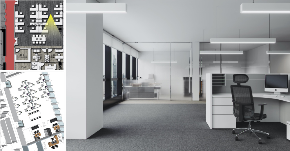 开敞办公区吊灯取消,改为嵌入式吸顶灯,样式为条形LED