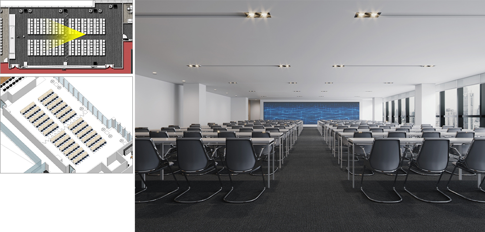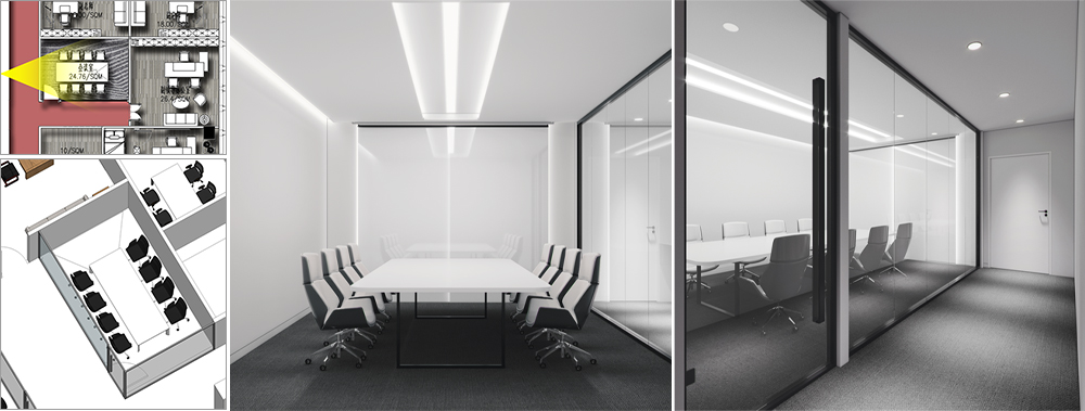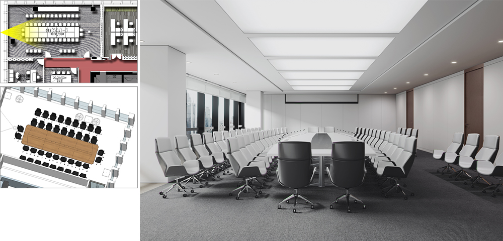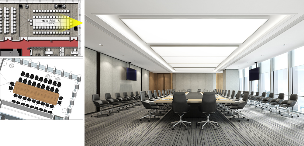 2. Meeting room: All use LED screens without projection. The LED screens should be concealed and have a flat wall surface. Use a white matte paint board, or if you have better material recommendations on your end