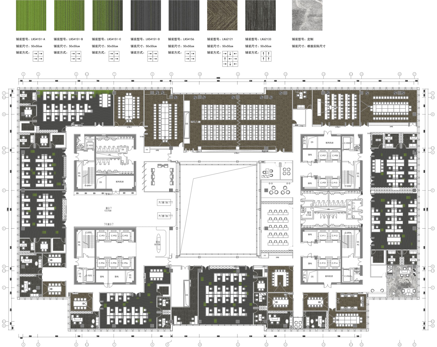 1、开敞办公区:所有顶部按石膏板平顶,不采用矿棉板吊顶