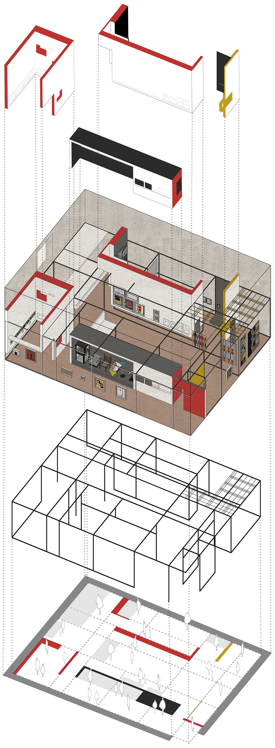 我们将艾尔伯斯设计的彩色玻璃窗的几何构成提取成为展厅的平面网格,并与展厅内中轴线上西扎留下的窗洞开口形成轴线对位,形成了展览的平面参观流线;然后将平面网格系统垂直升起形成展厅内悬挂体系的结构支撑网架。展墙被归纳成为高低不同、围合方式各异的四组盒子,再依据不同主题以网格为轴将四组盒子置入,围合穿插形成相互连结又相对独立、环绕分布在矩形展场之中的展示空间。
