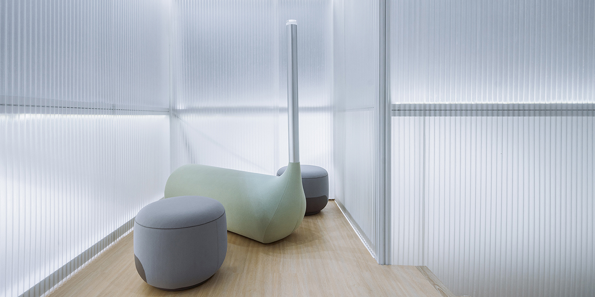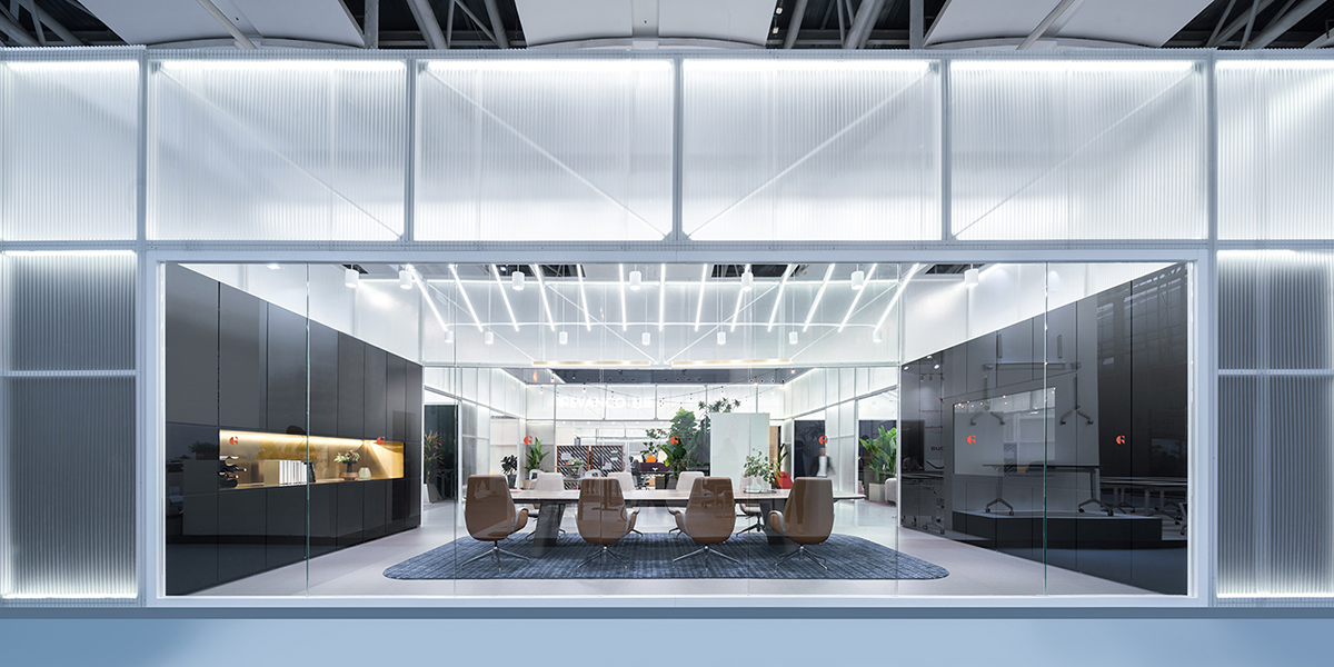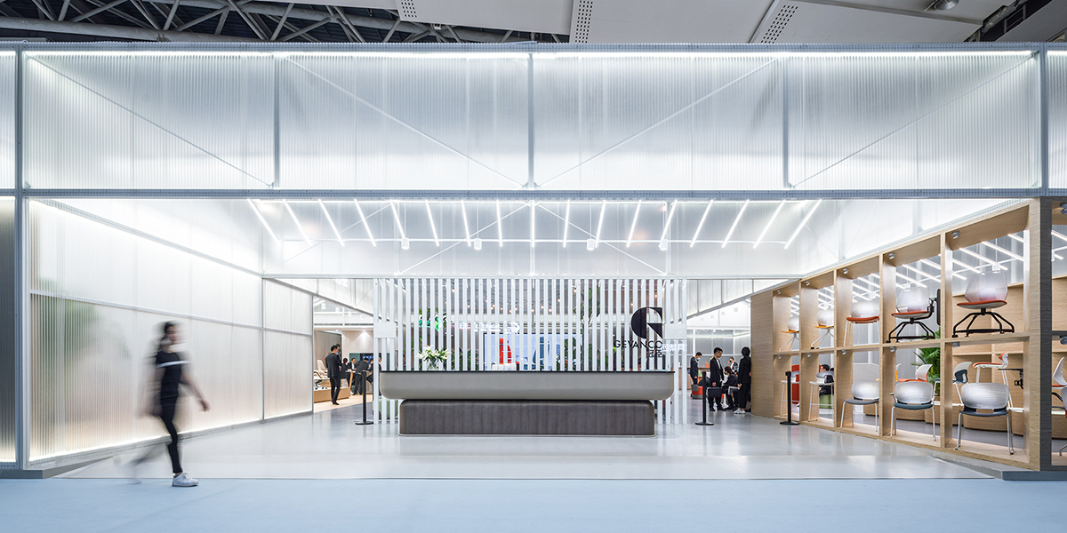 Working with a large 1800 square-meter rectangular space, anySCALE drew inspiration from the Beijing 四合院 Siheyuan courtyard concept, adding a contemporary twist by incorporating modern manufacturing materials that represent the industrial nature of Gevanco. Translucent exterior walls and extensive back lighting create a lantern-like effect, drawing the crowd towards the radiating glow of the fair booth. At the focal corner, the papery facade is punctuated by angled wooden window displays, offering curious spectators an unimpeded view of the company’s latest office chairs and the spaces within.