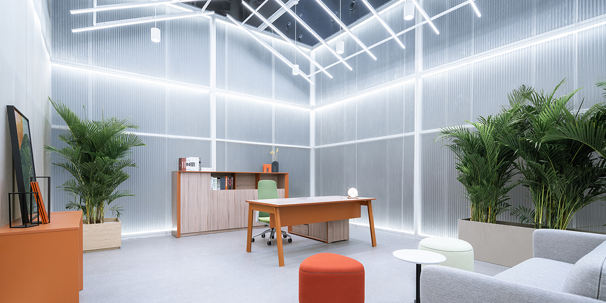 Just beyond reception, guests are greeted by a lively garden party. A web of bare industrial bulbs, a bright LED display and vivid green foliage create a festive environment for visitors to socialize and lounge on the furniture before touring the surrounding office spaces. The interior walls feature corrugated poly carbonate and felt materials to provide an industrial aesthetic and sound dampening acoustics. Divided by another chair display, the other half of the courtyard is a co-working area housing long desks and collaborative work stations. Circling the courtyard, quieter, more intimate executive office and conference showrooms house the rest of Gevanco’s high quality office furniture.