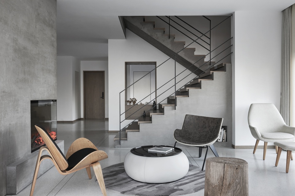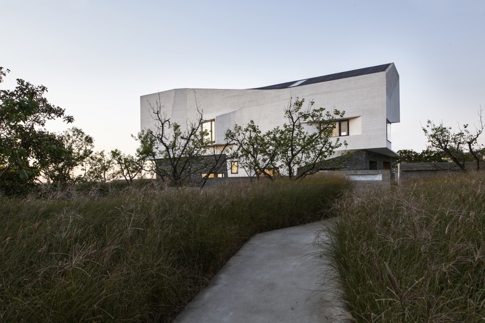 The House T’s north façade is reconfigured with two volumes interlocking together: a thickened white T-shape cast-in-concrete wall sitting on a dark layered schist rock plinth. This solid “T” armour of the north façade shelters the building from cold winter northern winds, while at the same time its undulating surfaces and punched in and out openings provide the audiences with a vivid expression, as most of the public coming towards the beach and the chapel will pass by this prime located property along the north side.