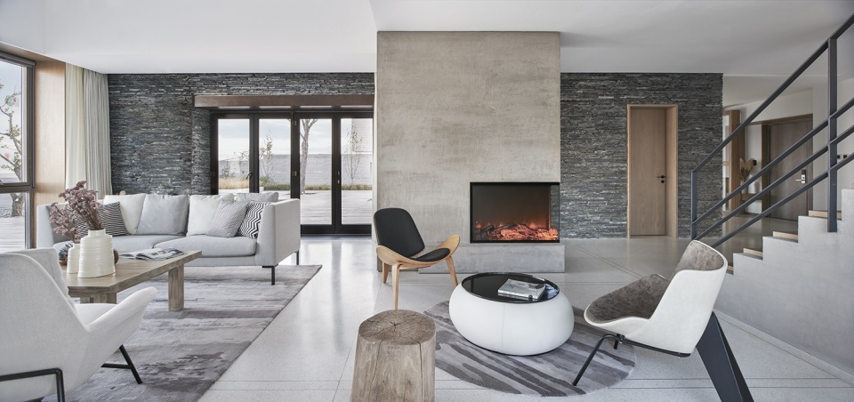 ▼一层起居室空间,设有精心布置的大窗,面向无需打理的外部花园,享有极致的景观视野