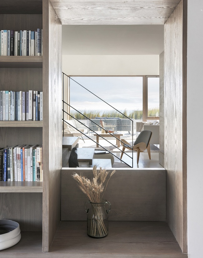 Our architectural intent was to create a series of dynamic spaces that could work for multiple gathering niches and more communal spaces for entertaining. As one wandering into the House T from the arrival entrance, diffuse light streams in from all sides through the building, as well as the airflow. The house has an abundance of strategically located large windows, providing abundant day light, minimizing the need for lighting. While the ground floor been fully open-planned throughout with semi-outdoor vestibule, kitchen, dining and library, the generous heights of the living room give a feeling of openness and airiness which embraces the views of sea and sky. These living spaces positioned at the ground level, facing a maintenance free exterior garden in a flexible state between private gathering and communal bypass, also engages in its best capacity to connect to the beach activities. On the contrary, deep window seats under the skylight in the library take advantage of the secret vista, creating the perfect place to relax with a book for some private time.