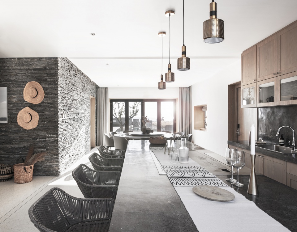 the dining room on the ground floor with windows guaranteeing the daylight, the walls are cladded with the rock strips