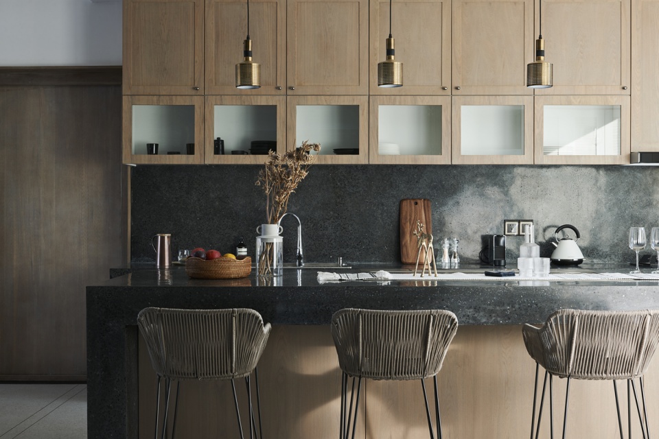 ▼一层餐厅和厨房局部,采用木制壁柜和大理石台面